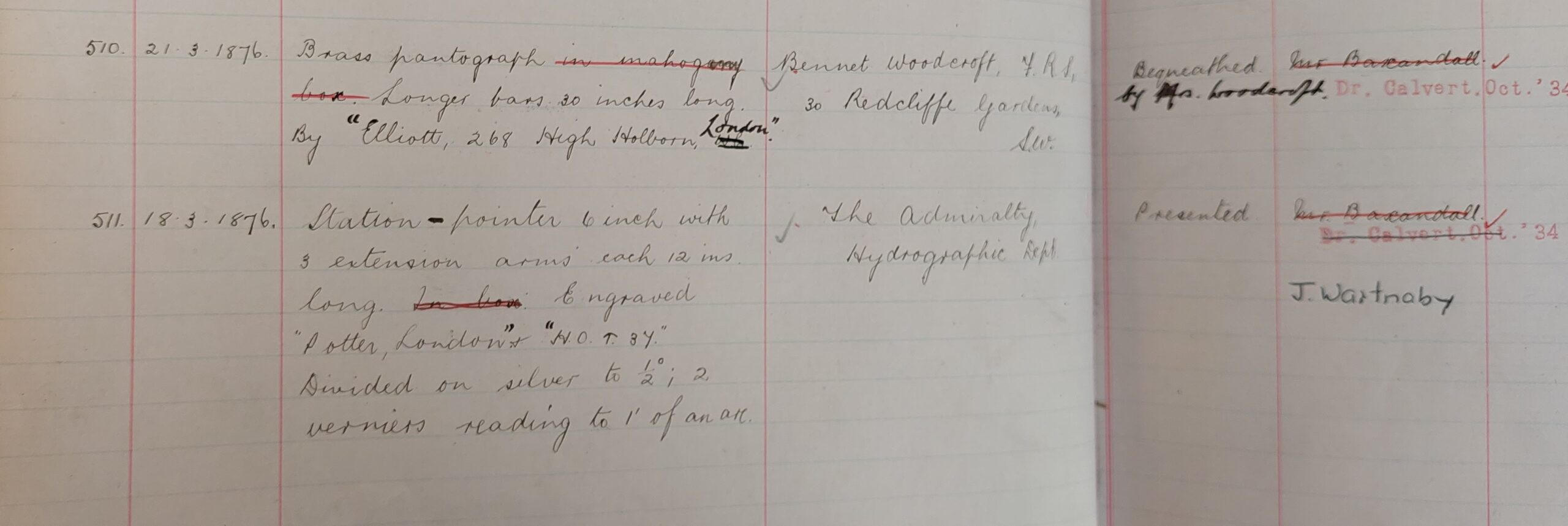The two entries in the inventory ledger illustrated from March 1876 show retrospectively when two (retained) items were first included in the South Kensington Museum’s Collections early in the process of assembling the Loan Collection of Scientific Apparatus. Information on Mrs Woodcroft’s bequest of her husband’s William Elliott-made brass pantograph (item 1876-510), originally included 21 March 1876, appears to have been added at a later date, presumably after Bennet Woodcroft died in 1879. By contrast, the Admiralty Hydrographic Department’s 6-inch pointer dial (item 1876-511) made by Potter of London, registered on 18 March 1876, was simply recorded as ‘presented’ i.e. donated, presumably soon after the Loan Collection was dismantled in 1877.