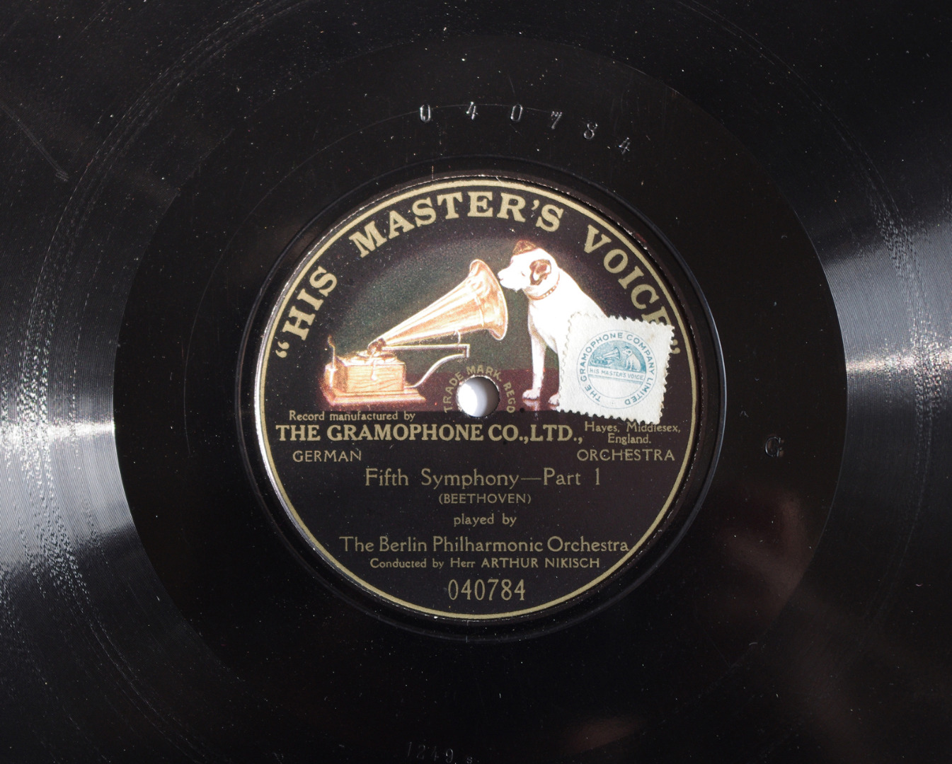 https://dx.doi.org/10.15180/150302/002The 1913 recording of Arthur Nikisch and the Berlin Philharmonic Orchestra’s interpretation of Beethoven’s C minor Symphony (No. 5) holds a special place in the history of recorded music. Not because it was the first complete recording of a symphony, as that had already been achieved some three years earlier, but because it was the first recording of a complete orchestral work by a world-renowned conductor, now considered to be one of the greatest conductors of all time, together with a leading professional orchestra.[1] What is arguably of equal significance is that it was one of the very first attempts to capture the natural sound of a full orchestra in the studio, and without the substitution of harder-to-record instruments as was commonplace throughout the ‘acoustic’ period.[2] The recordings are highly successful in this respect, and testimony to the skills of the studio engineers or ‘experts’ who were working at the very limits of what was feasible using the technology of the period. In acoustic sound recording, musicians play in front of a large tapered horn that channels the sound energy and causes a diaphragm, enclosed in a soundbox or recorder connected to the narrow end of the horn, to vibrate. These vibrations in turn modulate an attached cutting stylus, allowing it to etch an undulating spiral groove on to the surface of a warm wax disc or cylinder, corresponding to the diaphragm vibrations and thus recording the sound information in physical form. Given the challenges of recording in this way, it is not surprising that this version of Beethoven’s Fifth Symphony remains one of few recordings of the early acoustic era that employed such large orchestral forces and without substitution of the lower stringed instruments. In fact the practice of using pared-down ensembles with substituted instrumentation to represent orchestral music would continue until the mid-1920s when there was a wholesale change-over to electrical methods of sound recording.