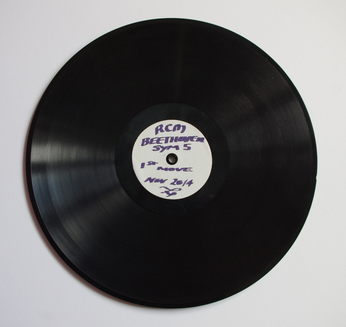 The RCM sessions began by playing the original 78rpm disc pressings of the Beethoven symphony from 1914 on a horn gramophone of the period.[33] As well as demonstrating mechanically reproduced sound, the playback served as a reminder that these records (and the ones we were about to make) were designed to be played on such technology with all its inherent limitations and advantages.[34] The original pressings were also recorded as digital files via a separate turntable and these were used for comparison purposes, to gauge the level of the newly recorded wax discs against the original recordings and to compare the overall balance of instrumental sections.