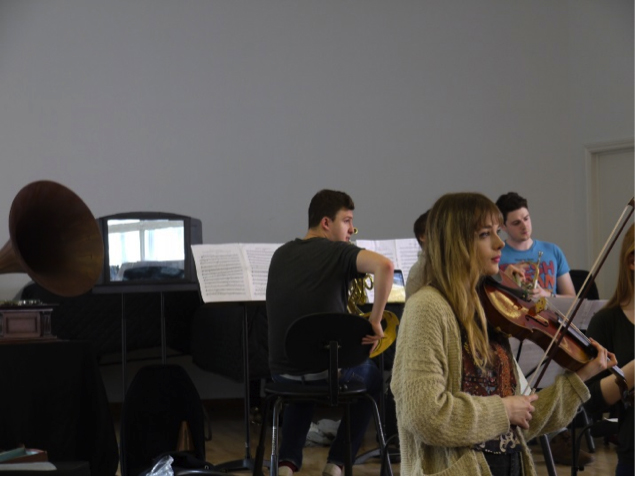 In order to give some context for the musical comparisons that follow, it will be useful to provide a picture of what this project was like for the participants. Preliminary findings from interviews indicate that, in general, the postgraduate and undergraduate students that made up the RCM Chamber Orchestra were very interested in the project. Some knew more than others about acoustic recording and the performance style they would encounter on the Nikisch recording, but they seemed to be aware that this was a unique opportunity. The students worked diligently during the recording sessions, which were clearly hard work – the conditions were hot, cramped and intense, and at times rather boring as they had to do a lot of waiting while the recording technology was prepared and tests were being undertaken.[75] Even though the room was bright and airy, the temperature had to be kept much warmer than was comfortable in order to keep the recording wax warm and malleable, and the musicians had to crowd together to be within range of the recording horn.[76] Despite the difficulties of the situation, the musicians said that they found it a fascinating experience – to record in such intense circumstances and to hear themselves through the medium of acoustic recording was even more interesting than many had expected.[77]