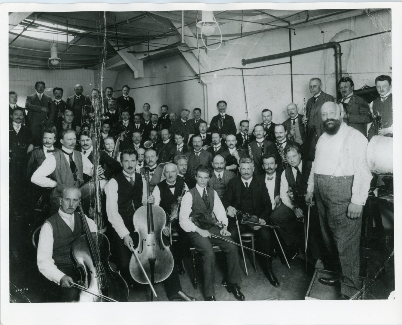 We are left to rely on contemporary photographic evidence to guide us in arranging the musicians in front of the recording horns.[29] While some photographs show the musicians facing towards the camera rather than the recording horn, their positions remain basically the same as during recording, although players at the front might be placed far closer to the mouth of the horn for the recording than pictured. A common arrangement was to place the stringed instruments (and soloists) at the front, facing towards the horn mouth; woodwinds playing across the face of the horn, while the brass is situated at the very back. Timpani, if used, are placed outside the sector of the horn to prevent overloading the soundbox diaphragm during loud passages. In most cases, the brass and woodwinds would be seated on specially constructed platforms as this would enable the sound of each instrument to have a clear trajectory towards the mouth of the recording horn. Space was at a premium and musicians were packed very closely together to stay within the horn’s recording range. Music stands gave way to sheet music suspended by string from the ceiling using clothes pegs and some studios installed special rigging on the ceiling for this purpose. The conductor would stand elevated to the side of the recording horn; the room, even for an orchestral session, would be of a small size so as to contain the sound and reflect it back into the mouth of the horn. Because the musicians had to play louder than in a concert hall and very much closer together, the sound in these studios would have been intense.[30]