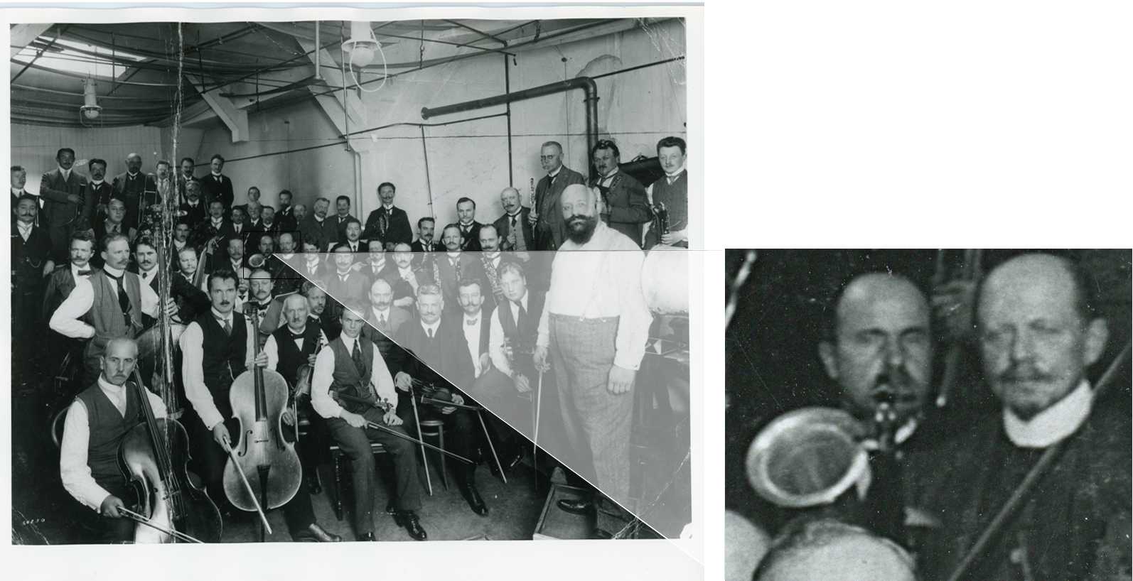 Aside from listening to the recordings there is some additional evidence confirming that neither the September nor November BPO recordings were re-orchestrated (i.e. the musical score adapted and instruments substituted). Firstly, a German record brochure advertisement for Beethoven’s Fifth Symphony lists the full instrumentation as specified by the composer, and is therefore promoting it as an authentic orchestral recording.[25] Secondly, there is a portrait photograph from September 1913 of Alfred Hertz and the BPO in the studio, taken at the recording of Parsifal.[26] The picture shows a fifty-two-piece orchestra, unusually large for the studios of the time, with approximately sixteen violins and violas, at least two cellos and three double basses.[27] The customary Stroh instruments are out of view, hidden in the back row of the string sections, a lone horn from a Stroh violin betraying their use and evidence that they would have reinforced the conventional violins and violas rather than dominate them. The orchestra for the recording of the Fifth Symphony would have been a smaller size than for Parsifal, but there is no reason to doubt the advertised authentic instrumentation. Max Hampe and his studio assistants had managed to capture the sounds of both a Wagnerian and a classical orchestra, without re-orchestration and for commercial release, perhaps for the first time in recording history.