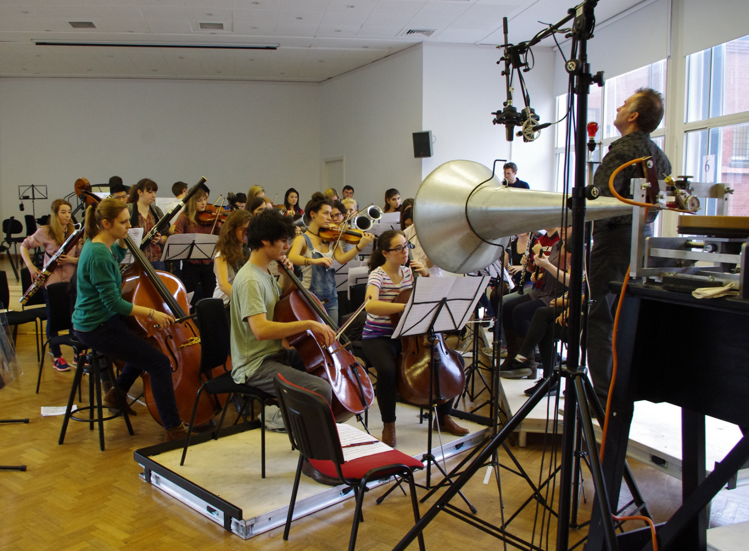 Two Stroh violins and a Stroh viola were used along with their conventional counterparts, as specified in studio memoranda.[31] They were initially positioned at the very back of the string sections on a riser, as suggested by the Stroh horn in the 1913 photograph of the BPO, but because of the general faintness of the violins and violas on our test recordings, they were moved forward, taking a central position in among the other string players and closer to the mouth of the horn. The improvement in the overall balance of orchestral forces and the added presence of the violins and violas on the recordings was especially noticeable in the quieter passages of the Andante movement. The stage of the RCM’s Recital Hall was used for the brass and timpani; the two French horn players had to be seated backwards so their bells faced towards the recording horn, and a mirror was installed so that they could watch the conductor’s movements, as was standard practice in the acoustic recording studios.[32]