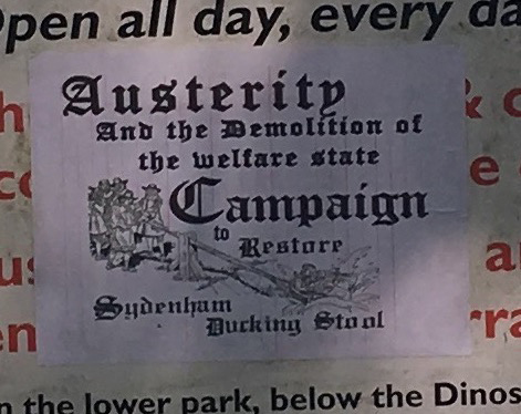 An unsanctioned posting interrupts the official sign that informs visitors about the Park Cafe’s operation hours and offerings. Black gothic font on plain white paper states, ‘Austerity and the Demolition of the Welfare State Campaign to Restore Sydenham Ducking Stool’. A line drawing depicts men lowering a woman into water upon said ducking stool, an absurd and heavily gendered punishment that was used for centuries to censure individuals in public settings, though the practice fell out of use by the early nineteenth century, well before the debut of the geological islands in the Crystal Palace Park (Underdown, 1985). The flier offers no other details, but the absurdity of its platform signals that it must be satire. Like the theft of cement teeth in the 1850s, the practice of postering is a material way through which the public asserts a relationship with the Crystal Palace models and the park that hosts them. Moreover, the critique of national policy that this particular poster puts forward resonates with the easily undone progress narrative that Victorian visitors to the Crystal Palace would have experienced as they took in, simultaneously, the wonders of former empires along with the message that these empires, no matter how grand, ultimately fell (Piggott, 2004: 75).