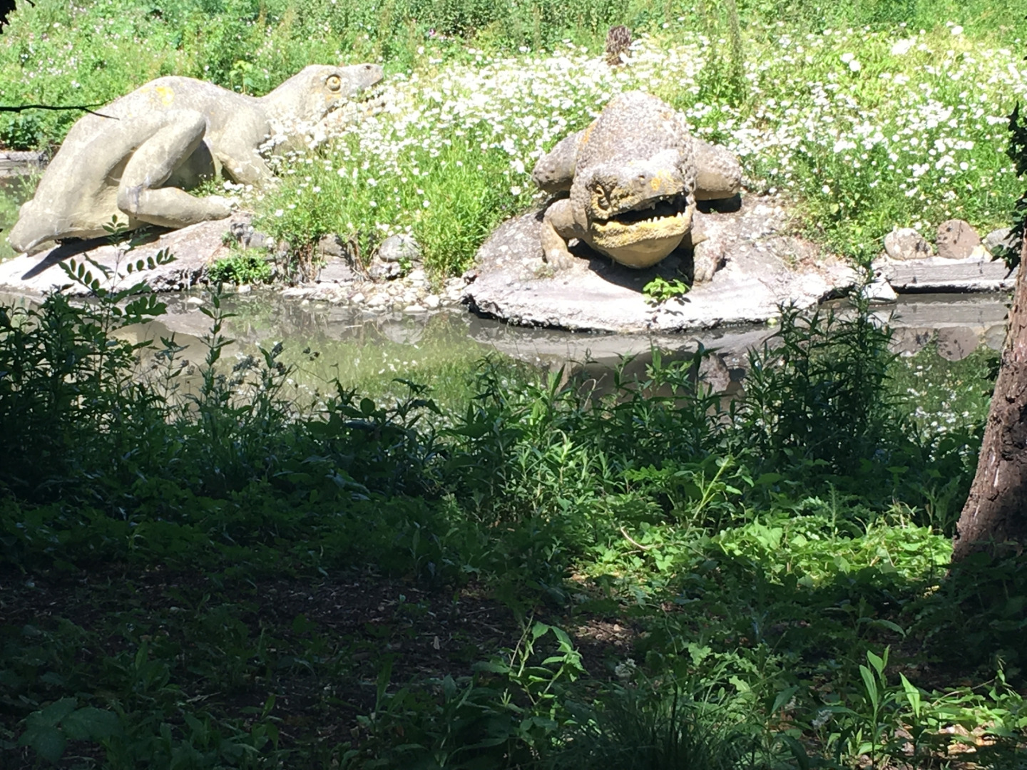 The most recent restorations have been overseen by the Friends of Crystal Palace Dinosaurs, a charity organised in 2013 that deploys the term ‘dinosaur’ loosely to encompass all of the prehistoric animals on display in the park. As Ralph O’Connor (2012: 494) has demonstrated, the use of the word to describe the statues is, beyond being a categorical overstatement, anachronistic. For while Richard Owen coined it in 1842, the popular adoption of the term dinosaur in place of ‘antediluvians’ and ‘extinct monsters’ would not happen for another fifty years. The Friends’ express mission is ‘to ensure the dinosaurs survive our generation intact, so they can be enjoyed for future generations’. In addition to offering public engagement programmes, lecture series and resources that communicate the Victorian history of the site, the Friends collect stories from people who use the park to this day. The group also raises funds to repair the crumbling models and organises the Palaeo Planting Project, a community effort of volunteer labour to introduce plants deemed ‘historically and scientifically appropriate’ and to weed out those determined inappropriate (Friends of Crystal Palace Dinosaurs, (‘Reviving lost worlds’) and (‘Who are Friends’) n.d.).[6]