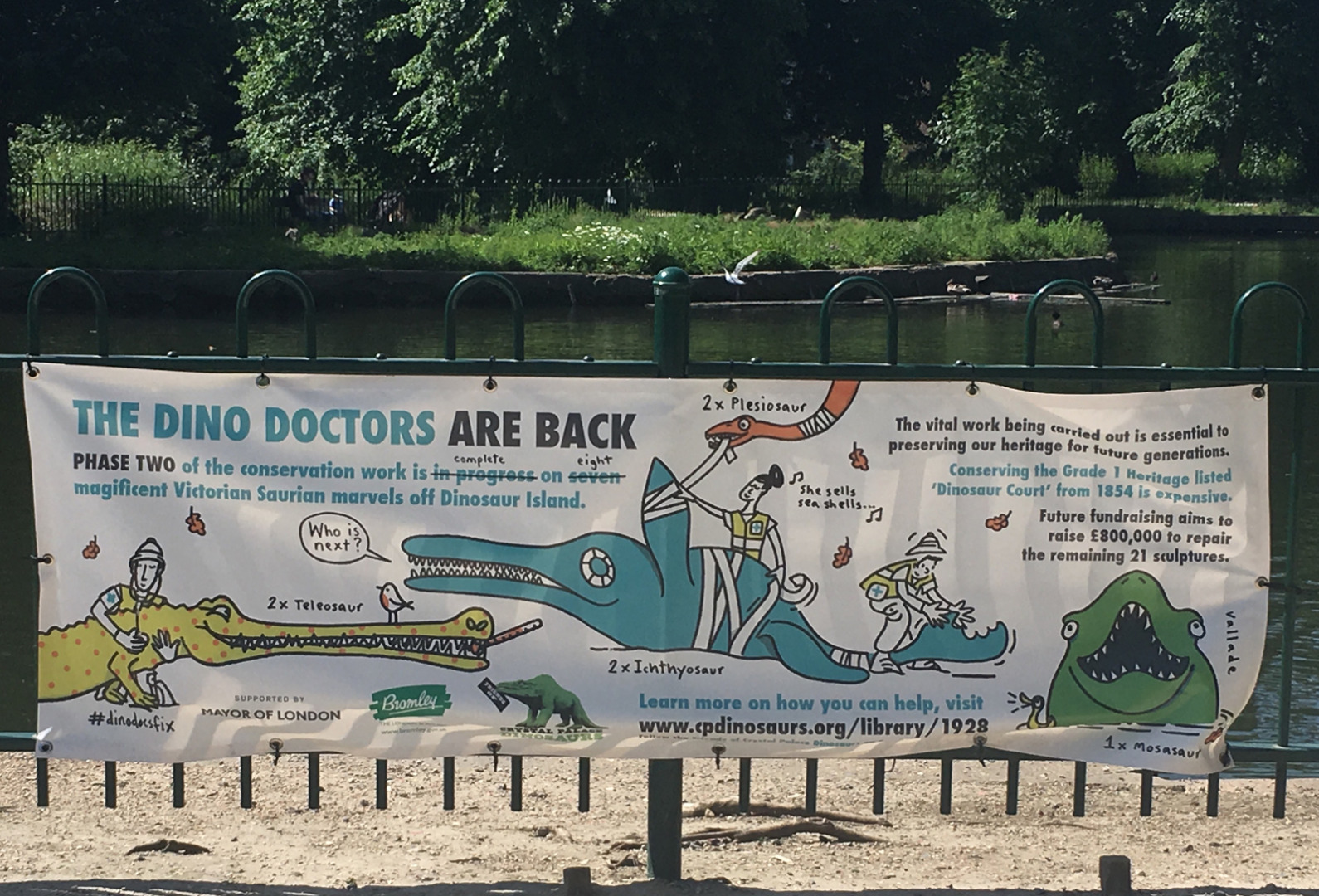 https://dx.doi.org/10.15180/191102/006The discourse with deep time continues and, indeed, it is fostered by the Friends who ‘encourage [visitors] to draw their own meaning from the site’ (Friends of Crystal Palace Dinosaurs, ‘Who are Friends…’ n.d.,). Such discourse is idiosyncratic and often ephemeral; and yet, some of these interactions do leave material traces. The practice of postering over signs in the park, for instance, is a manifestation of contemporary public engagement with the prehistoric animal models. Visitors who saw conservators working on phase two of conservation work on the ‘Victorian Saurian marvels’ during the summer of 2017 may have also spotted fliers posted about the park that lambasted austerity politics through satire (see Figures 11 and 12).[7]