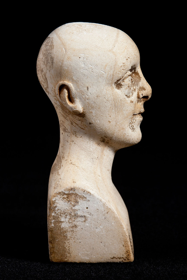 On examination now, each of the busts is around 7.5 cm tall by 3.5 cm wide, with a depth of about 4 cm, depending on the size of the head and nose. They are made of solid plaster, and were probably finished with an animal glue or rabbit skin size (or wash), traces of which are found around the eyes, nose and ears of some of the busts (see Figure 2). There are brush marks on the surface of the plaster, suggesting that a smooth and blemish-free finish was not required (see Figure 3). Each bust is marked with its number in the sequence, from 1 to 60, scored into the reverse. Bust 1 also carries the identifying inscription ‘By Wm Bally 1832’ on its reverse (see Figure 4). Many have a shiny dot of pigment on the back of the head – at the point at which it makes contact with the wooden box – perhaps a shellac polish from a previous box.