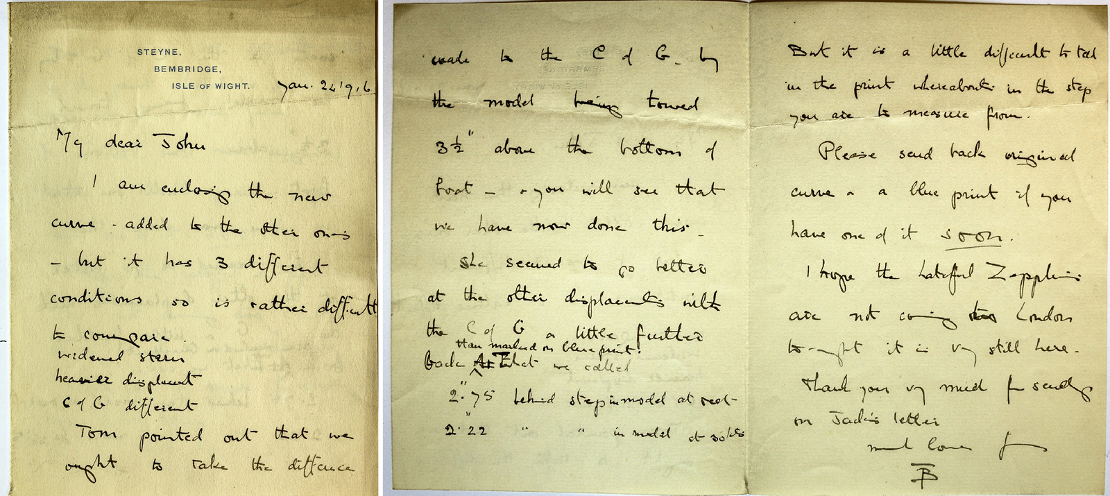 The Thornycroft Archive also contains a letter written by Blanche on 24 January 1916, which demonstrates her understanding of naval architecture as communicated to her brother John Edward Thornycroft. Her work consisted of drawing new curves to supplement earlier calculations under three different operating conditions – a wider stern, increased displacement and different centre of gravity.
