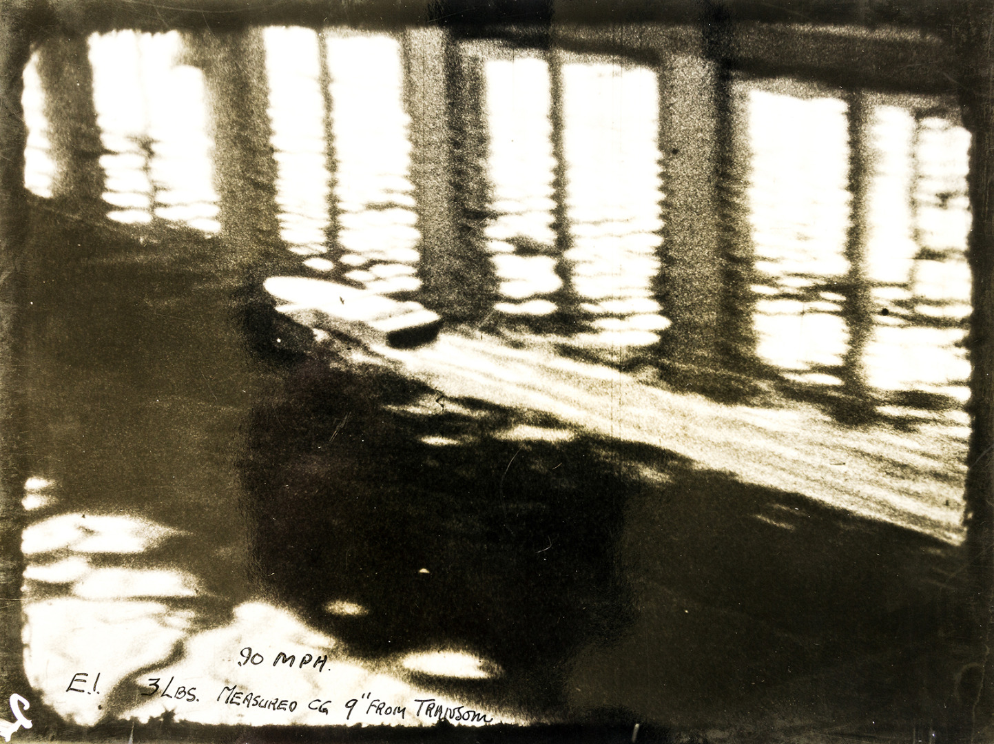 One of Blanche’s tasks was to try and improve the speed of the pull. Thornycroft were using the Cambridge Scientific Instrument Company to develop additional bars for the measurement process.[7] An undated photograph (see Figure 8) shows a model under test and is annotated in what appears to be Blanche’s handwriting – ‘90 mph EI 3 lbs measured 9 inches from the transom’. The speed referred to would have been arrived at by calculation from the scale speed and it is this type of work that was carried out by Blanche.