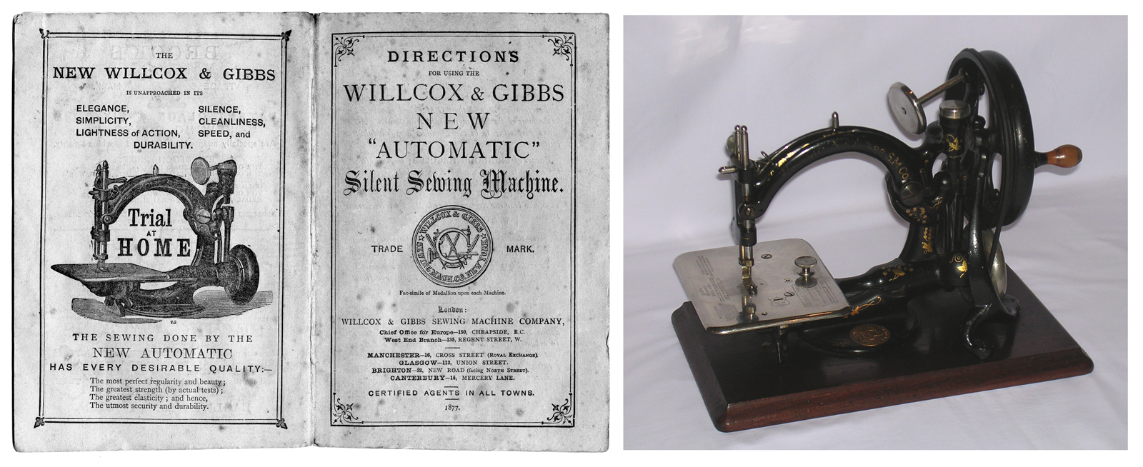 Figure 9 shows a Willcox & Gibbs sewing machine first manufactured in USA in 1857 as ‘the first low-priced…machine for the domestic market’ (Forty, 1986, p 96). This particular one was given to my grandmother on her marriage in the early twentieth century, and is the machine I learned to sew on. It is beautifully made and runs as smoothly as ever; its characteristic sound is an important feature and for this reason it is known in the family as ‘Mutton-mutton’; it also has a splendidly oily smell. Only by operating it myself do I understand its idiosyncrasies, and only by using it have I had an intimate experience of a machine first produced in the middle of the nineteenth century and which must have changed many women’s lives.