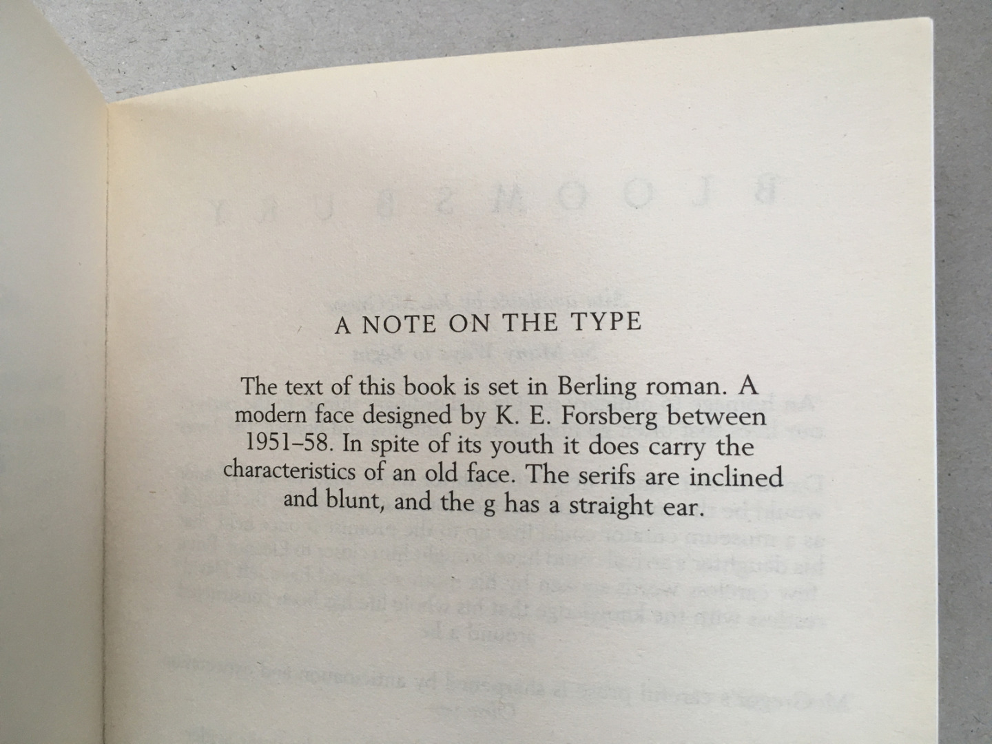 Sometimes the information about the typeface used in a given publication is to be found at the back of the book, increasingly as something of a feature on its own (see Figure 1). Indeed, such has been the proliferation of these ‘notes on the type’, that they have become a focus for pastiche, targeted by both the Paris Review (Russell, 1981) and the New Yorker (McCall, 1997), and even informing a fiction of their own in Jonathan Safran Foer’s ‘About the typefaces not used in this edition’ (2007). However, there is more to the inclusion of these small notes of typographic commentary in our mass-produced books than their comedic potential might suggest and an examination of the origins of this practice alerts us to potential significations beyond the immediate note to which our attention is called.