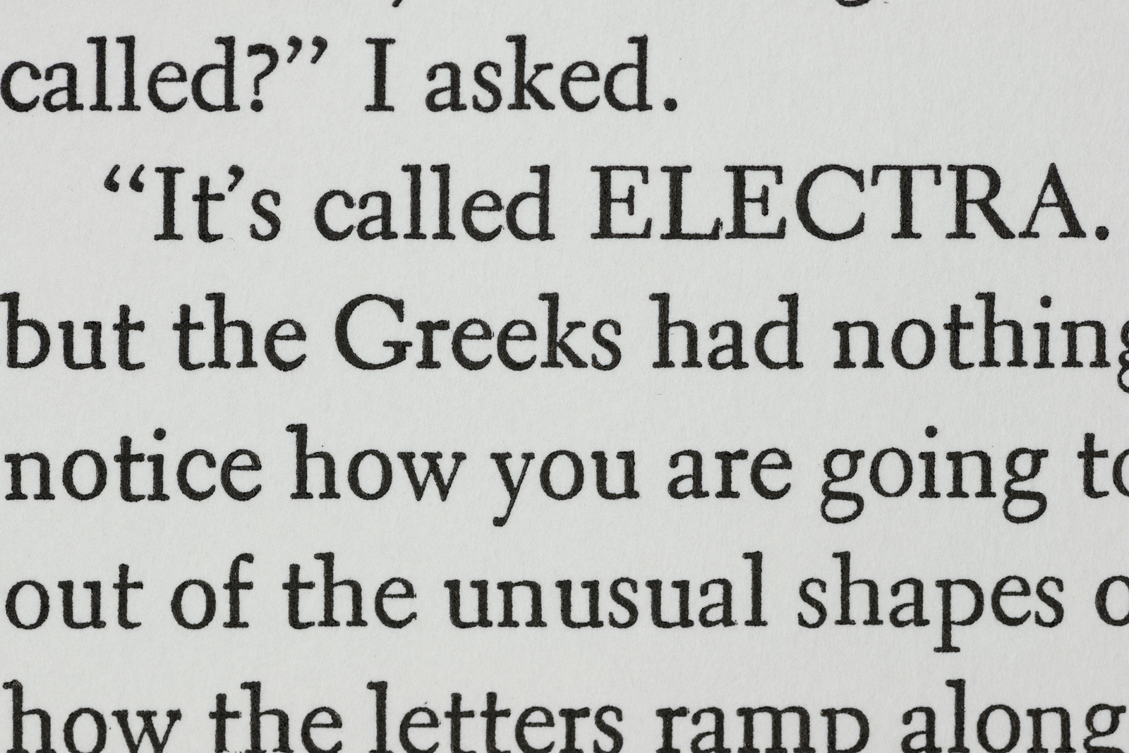 https://dx.doi.org/10.15180/191211/004In addition to acknowledging the act of selection itself, a note on the typeface for a given book may offer a rationale for the choice and an explanation of the intended contribution to the experience of reading. Starre observes (2016, p 75) of the ‘note on the type’ included in the first hardcover edition of Jennifer Egan’s A visit from the Goon squad as published by Knopf in 2010, that a step is made from factual information-giving to making explicit an assertion ‘that the text’s form is meant to trigger a specific aesthetic effect during the reading process’. The note in the Egan volume first introduces the name of the typeface (see Figure 2) and some classificatory details about the style of the typeface, before then going on to suggest that the formal features of the typeface contribute ‘a feeling of fluidity and power’.[4]