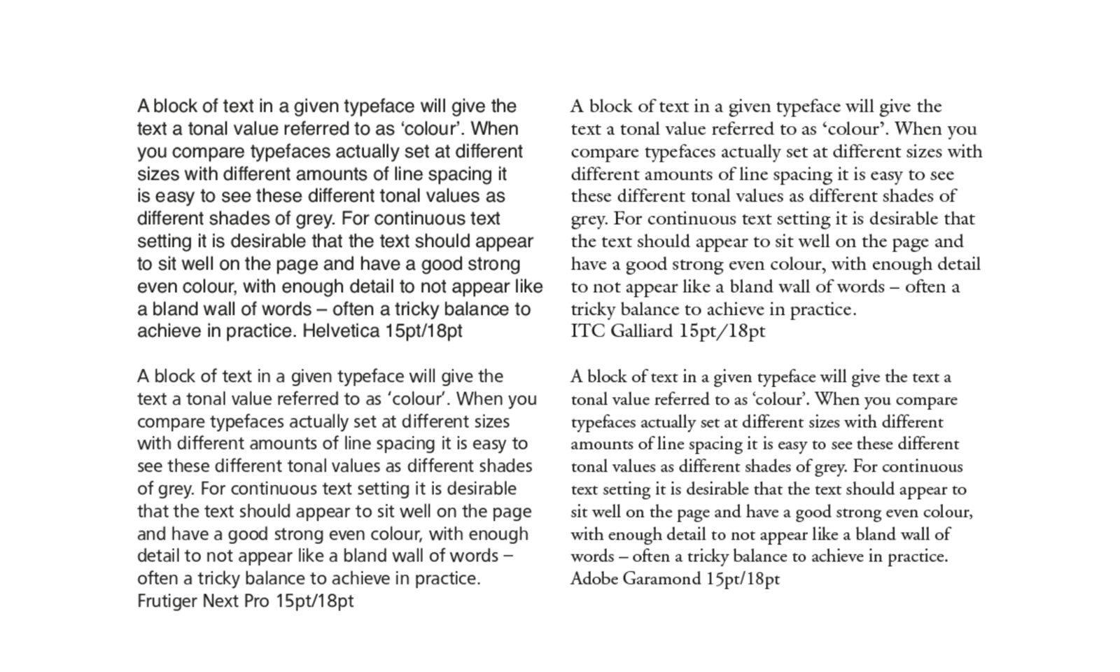 It is true that a typeface makes a very particular contribution to the colour, rhythm and overall texture of the letterform arrangements on the page (see Figure 4). For better or worse. Here ‘colour’ refers to a typographical description of the relative tonal value of the text block.