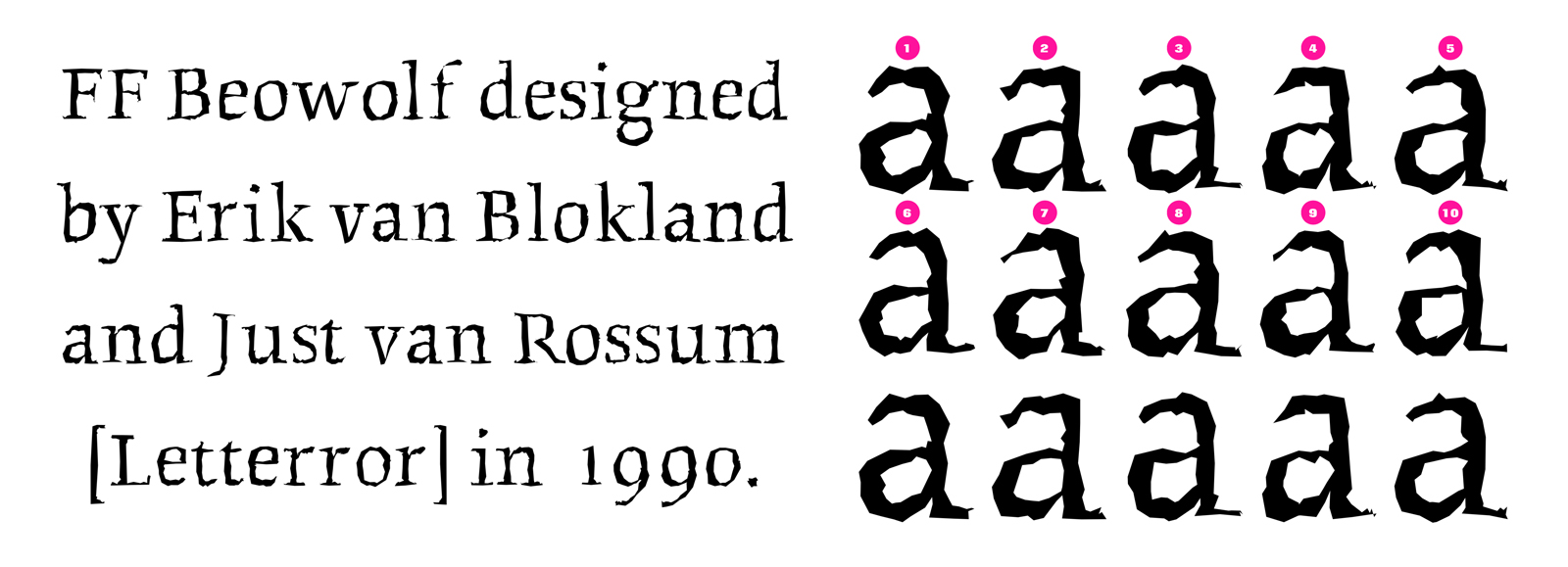 It is a typeface which really couldn’t have been generated in any previous technology but truly explored the potential of the digital. Ironically, as technologies have ‘advanced’ so the elements that allowed for the randomising of outlines in the original Beowolf font ceased to function. Now a rather tamed version of Beowolf alternates between only ten possible permutations of each character (see Figure 8), drawing from nearly ninety thousand glyphs created by an army of purpose-built bots. Immense and still with a ‘Faustian’ intent for mayhem, the typeface no longer roams the infinite variability of form it had to explore previously (Fontshop, 2019). And the romance is lost.