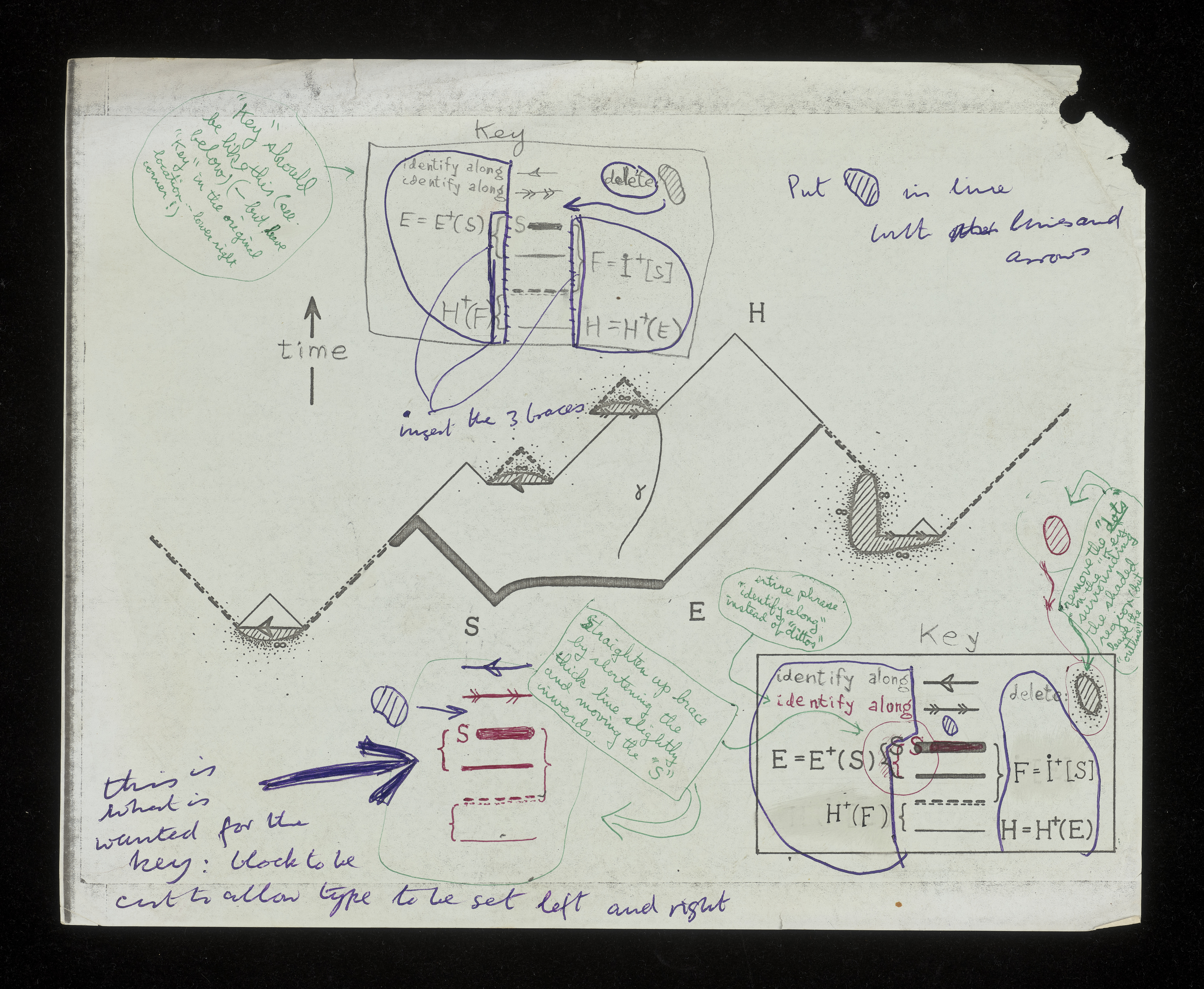 A later collaboration between the two men shows how they collaborated in the production and revision of a book and this in turn engaged a wider circle of colleagues, for example in reviews. The Large Scale Structure of Space Time (LSSST) (Hawking and Ellis, 1973) summarised geometry of four-dimensional spacetime in general relativity and some of its physical consequences, describing topological methods developed by Penrose and Hawking in the early 1970s. It was for specialists in this emerging field and was published in 1973 by Cambridge University Press. LSSST was largely written during a period when Ellis was a lecturer in DAMTP (1969–1974) and held several visiting appointments including in Hamburg in the summer of 1972, when the final text was being prepared and Hawking wrote to Ellis twice to coordinate the final alterations. At the time of writing the second letter Hawking had not yet had time to incorporate Ellis’ changes as Hawking was so pushed to get his lecture notes for Les Houches written (referred to above). He also notes he had rewritten the jacket blurb.[14] Ellis’ contribution to this collaboration found in the Archive includes five leaves of hand-drawn diagrams. For the second printing of the book, there is a copy of a typescript containing his corrections and amendments dated May 1974, including mathematical expressions. Prior to the copy being produced, these have been annotated with ticks, crosses and crossings out to indicate whether the corrections and amendments were accepted. The file also includes two pages of handwritten corrections possibly in the hand of Roger Penrose,[15] which Hawking requested following his review of the book, and some of which he incorporated.[16]