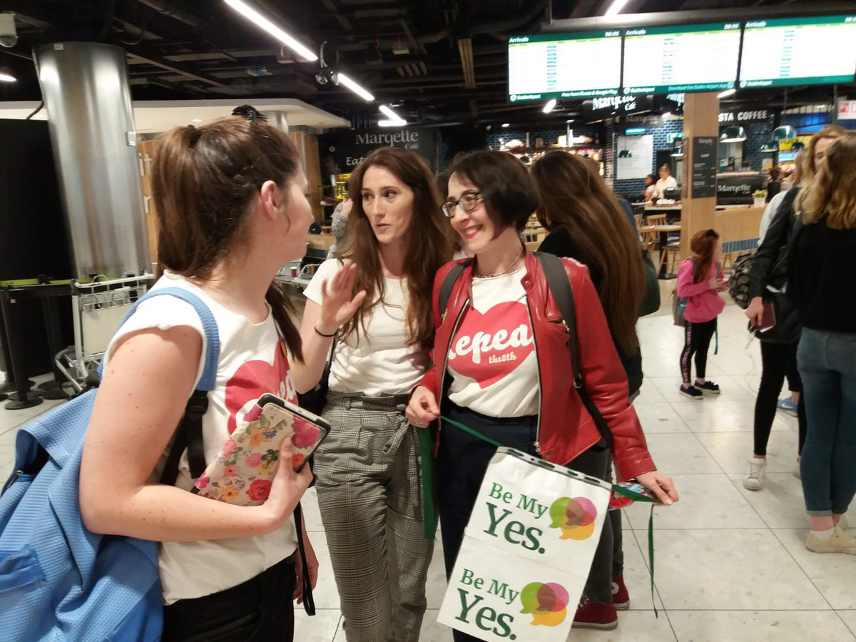 77 London-Irish women representing those who have to travel to access abortion lead a silent protest against the 8th Amendment at the Irish Embassy in London Breda Corish campaigns to Repeal the 8th at Dublin Airport as people come home to vote