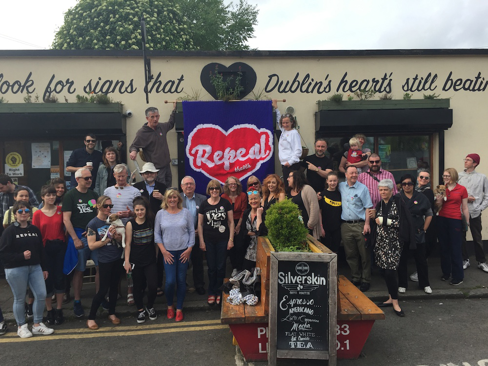 The knitted Repeal banner, with its maker Anne Phelan, outside a Dublin café