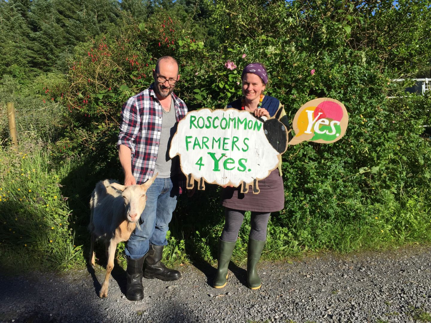 ‘Roscommon Farmers for Yes’ campaign banner, with makers Caroline and Keith Walsh The Donegal yarn-bomber ‘My Body My Choice’ dress, with maker Caroline Kuyper