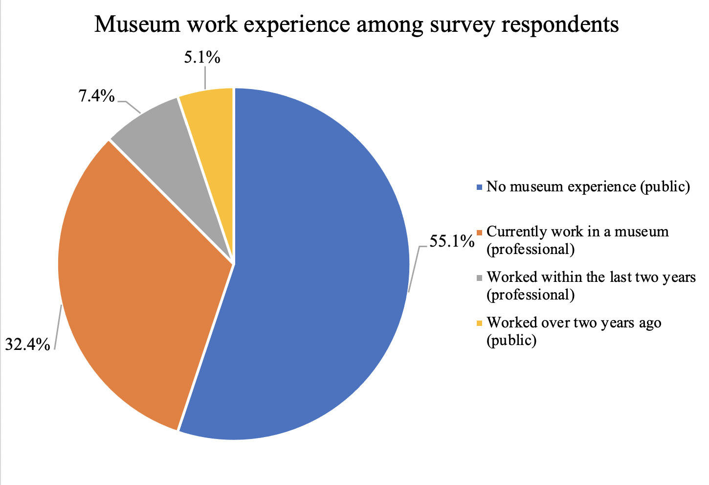 This demographic information has provided both an insight into the general respondent group as well as illustrating more specific details regarding public museum-engagement and the institutions to which the professionals belonged. As mentioned in the caveats section above, this demographic would benefit from broadening in future research, but provides a sufficiently varied participant pool for this case study.