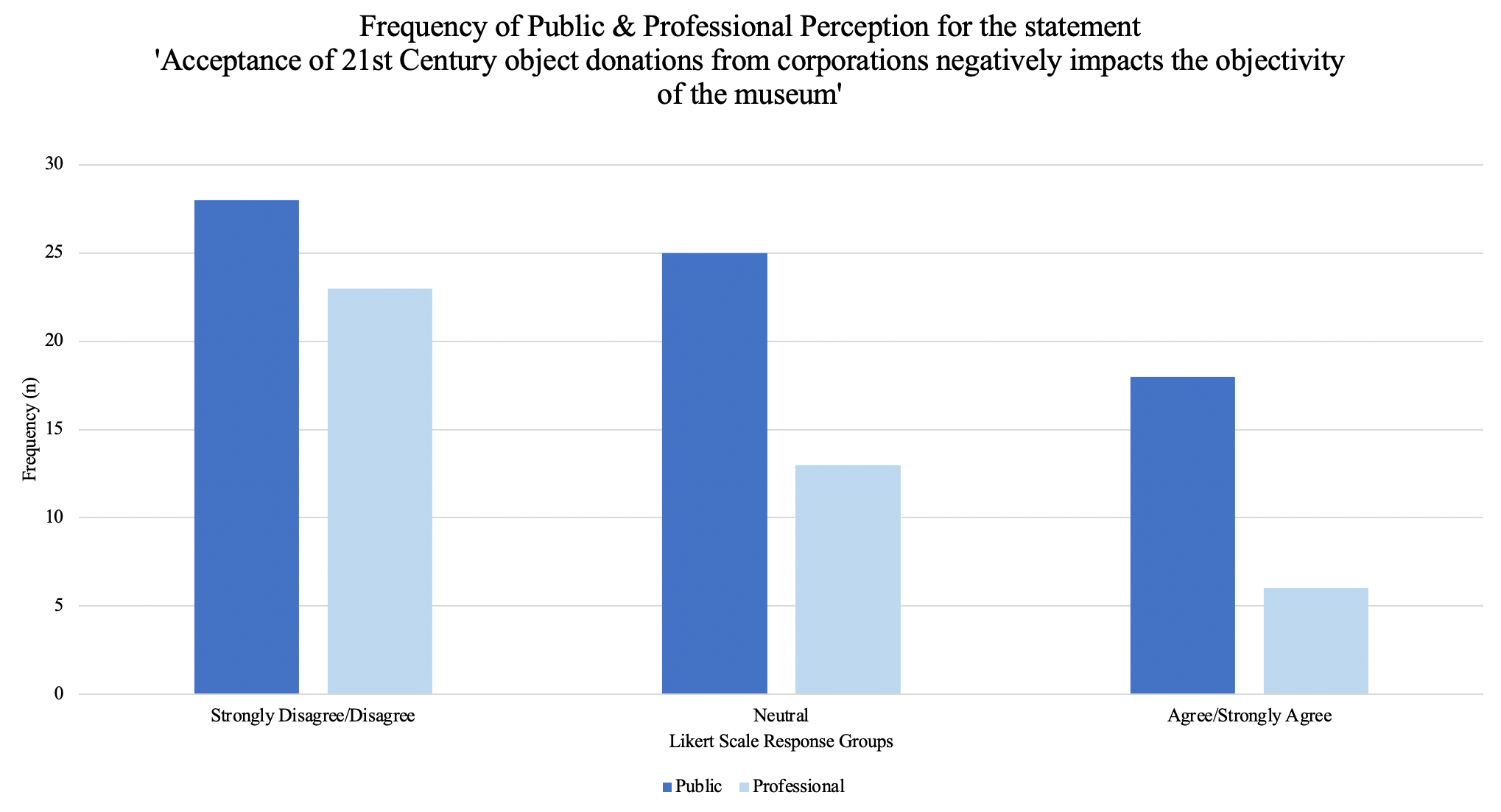 The concept of neutrality within museums is a complex concept to identify and study, and is particularly relevant to contemporary collecting, with over half of professional survey respondents (58 per cent) suggesting that neutrality can be harder to achieve when dealing with twenty-first century objects. It is clearly an important topic, and one that this research has shown to be an area of divergence between the public and professionals surveyed. Before analysing more specific survey and interview responses, the quantitative data was used to establish general opinions towards museum neutrality. This overview was created using a chi-squared test for independence into survey results for the statement ‘museums should remain neutral in all areas of information or discussion’. The test revealed a significant relationship between the public and professionals on their opinion regarding the importance of museum neutrality (X2(2, N=114)=10.06, p<0.05). Figure 6 demonstrates the increased public desire for museum neutrality, which contrasts with the professionals, who view museums as spaces without a fixed, neutral, authoritative voice.