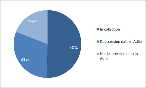 https://dx.doi.org/10.15180/191205/004Of the 65,751 records included in this analysis, 33,099 (50 per cent) remain in the permanent collection and have current locations. 20,102 (31 per cent) have been deaccessioned, and the remaining 12,550 (19 per cent) of records do not have current locations. The vast majority of this unlocated material is believed to have been disposed of long since (such as T.1869.63.40 ‘One of a collection of specimens illustrating preparations of sugar – manufacture of lozenges – a sample of sugar and gum mixed into a paste’). Disposal records can often be found, but these disposals are not currently recorded on the Adlib database.
