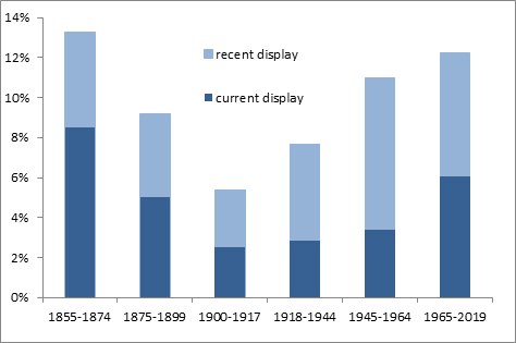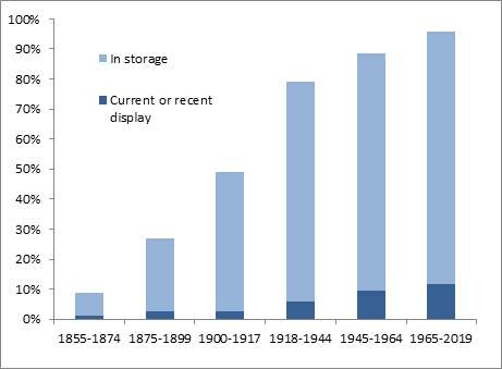 Current displays have considerably fewer total items on display, drawn from across the decades of the Museum’s collecting. All of the collecting periods are represented in our current and recent displays. The proportion of material collected in the twentieth and twenty-first century which is on display reduces with the length of time it has been in the collection. This could reflect material where the contemporary interest when it was collected has become outdated and it is not (yet) of historical interest. However, the nineteenth century collections do not continue this trend, showing the ten per cent of material that remains in the collection following the stringent reassessment after the Second World War is as well suited to our present exhibition purposes as material collected recently.