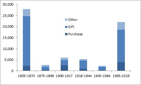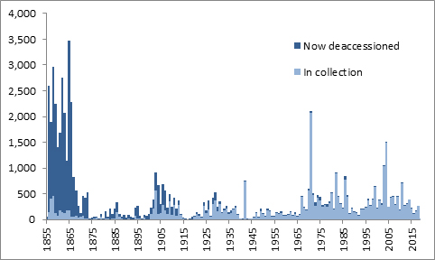 While all these data can be analysed individually or by year, in many cases the number of items in individual classes would be so small that the statistical validity of such analysis would be low. A mixture of analysis groups have been used, ranging from single years to the entire collection. Only limited correlations have been drawn between the ongoing collections development activities and the personalities and staff involved. This is a large potential topic and would be especially fruitful in a more detailed analysis of the specifics of the acquisitions and disposals rather than this qualitative overview of the collections.