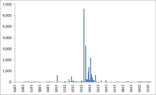 A chart of the number of records for each year of acquisition reveals the history of the department within the Museum. In the earliest years there was notably copious collecting, especially leading up to the initial opening of the first portion of the Chambers Street building in 1866, which needed material to display. The Technology department was established as a separate department in 1901 followed by increased collecting, and collecting of a different kind of material. Some individual years display the vagaries of the documentation system and limitations of the analysis used. In 1942, a slightly surprising 741 records occur despite what was otherwise a hiatus in collecting during the war. However, almost all of this was a single acquisition, the pages of a photographic album and scrapbook having recently been given 738 separate part records to facilitate their digitisation. The year 1971 saw the Technology department acquire 1,402 blueprints and technical drawings.
