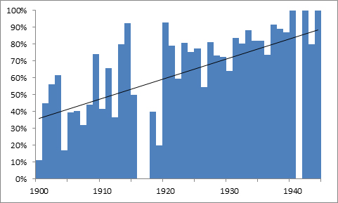 The retention of material acquired before this period of reassessment and disposal shows a strong relationship with the accession date. Material acquired in the decades immediately preceding the major reassessment of the collections shows a definite correlation between how recent an acquisition was, and whether it was kept. This probably reflected changing practices of acquisition since the material was collected and the type of material of interest, it is also a likely result of an ongoing interest in acquiring and displaying current technology that did not remain of continued interest as it became outdated.