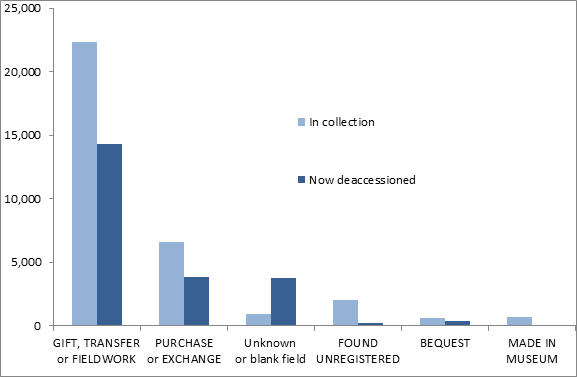 Gosden and Larson (2007) carried out extensive analysis of the acquisitions into the Pitt Rivers Museum using the digitised records to show ‘patterns in collecting activities’ examining closely both the collectors and categories of the collections. The present study is unique in also including a major contribution from historic collections disposal, and that from a period which predates most of the disposals discussed in current literature and debates (Davies, 2011).