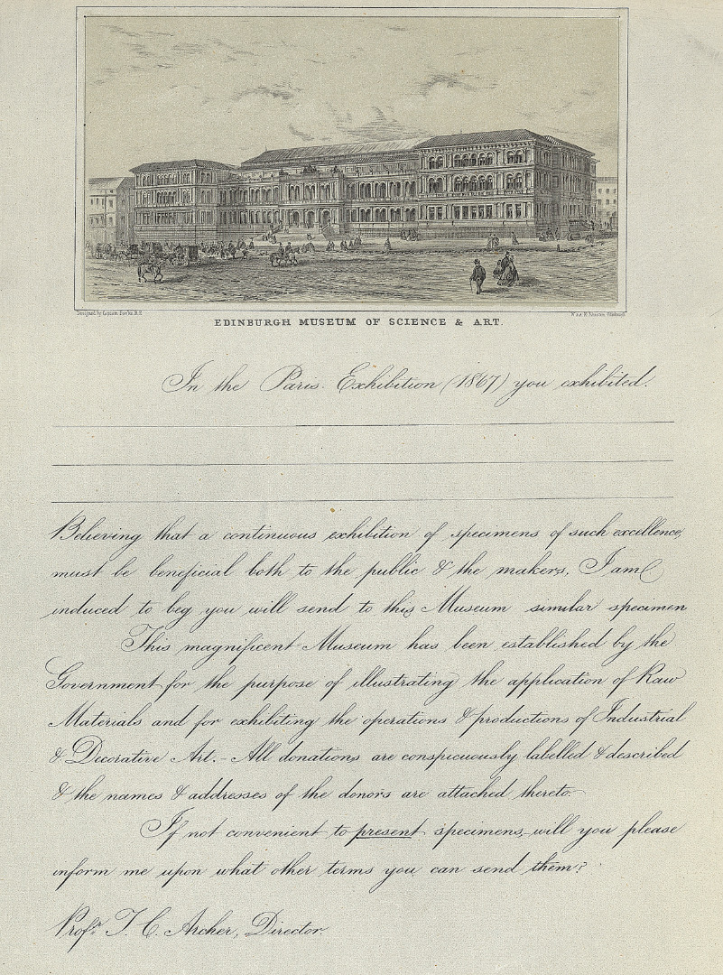National Museums Scotland traces its history back to several different organisations: the collections of the Society of Antiquaries of Scotland founded in 1780; the Zoological collections from the University of Edinburgh, initially established in 1697 and again in 1812 (though only nineteenth-century material survived to become part of the National Museums Scotland collections); and the Industrial Museum of Scotland, founded in 1854 and soon renamed the Edinburgh Museum of Science and Art before the opening of the first portion of its permanent home on Chambers Street in 1866 and renamed again as the Royal Scottish Museum in 1904 (Swinney, 2013). This range of origins has resulted in the National Museum holding plural collections, as do many other large museums, rather than a single collection. Not only did the different organisations develop their collections in different ways, but different departments within the same organisation, and even individual members of staff have left their mark on the collections (Alberti, 2009, pp 91–122).