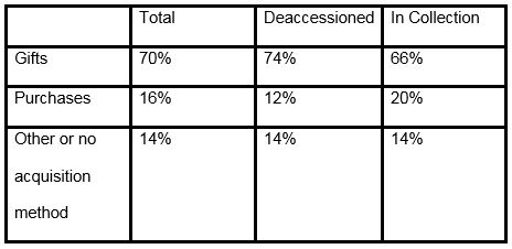 Over the history of the collection there is a trend for purchased objects to be kept and displayed in future to a greater extent than gifts, and a much greater extent than material which has been found in the collections or which was accessioned without the provenance being recorded. This is a potential lesson for current collecting, to ensure that found or donated material is given due critical consideration, and full provenance information recorded.