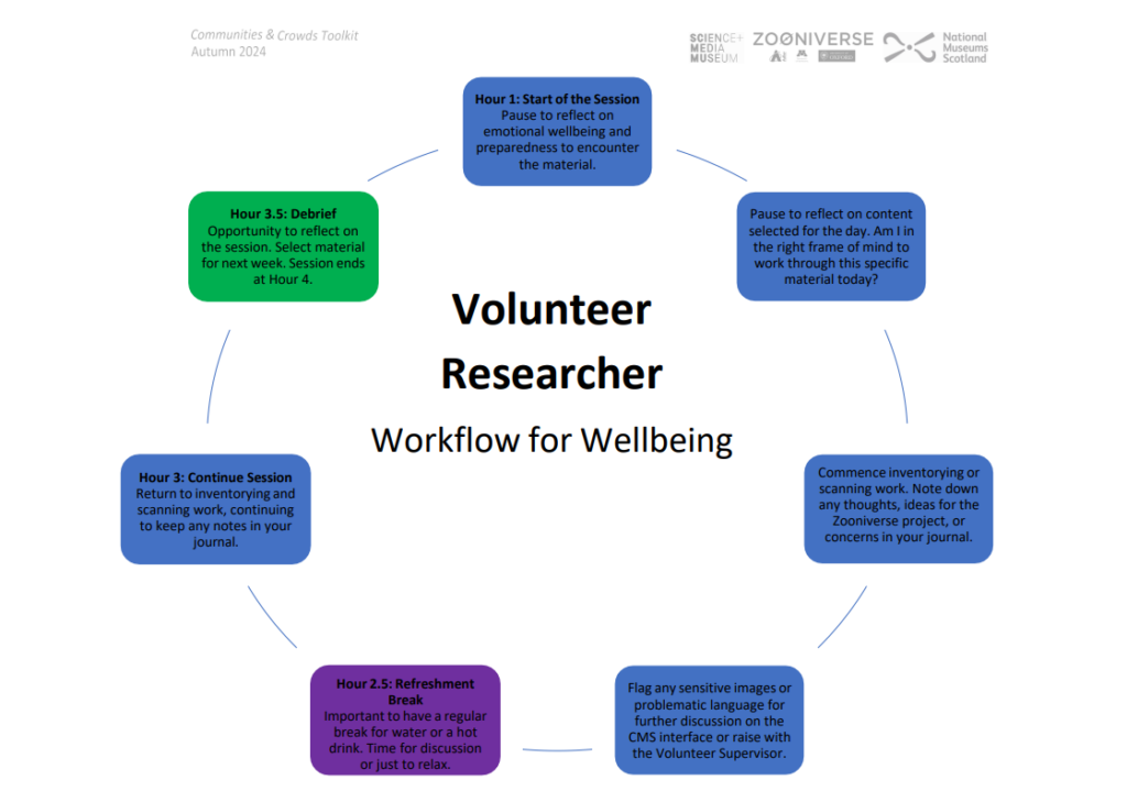Other costs to be considered are well-being and volunteer costs. We spent approximately £15 a week on tea, coffee and cake, which was a critical part of the volunteering sessions (see Figure 3 Workflow for Wellbeing). As part of SMG’s volunteering framework, volunteers are also offered reimbursement for travel expenses via public transport to attend in-person volunteer sessions.
