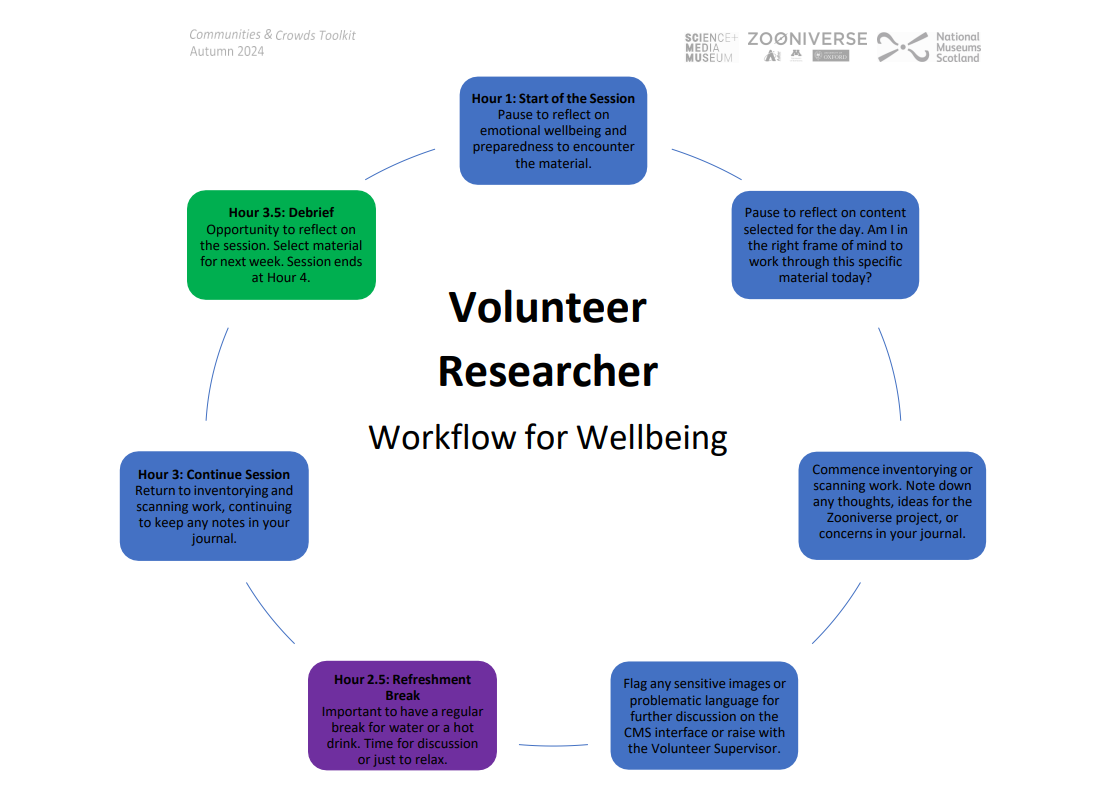 Based on recommendations made by BAATN, in-person volunteering sessions were structured around a wellbeing-centred workflow to ensure that there was always time and space for discussion, reflection and processing each week.