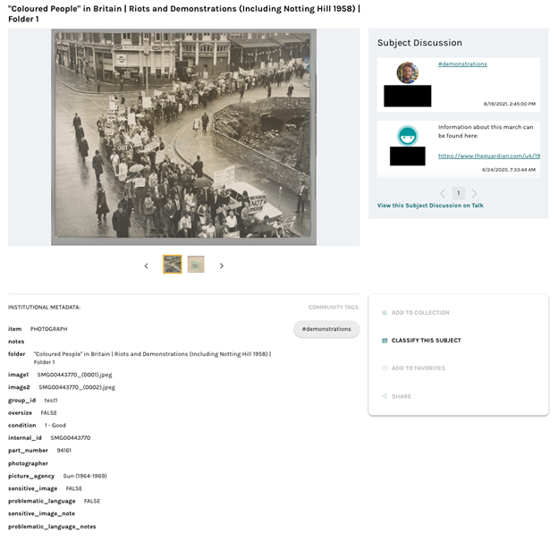 The app includes a home page with search/browsing capabilities, as well as an individual page for each photograph included in the project. The subject page displays any available institutional metadata, participant-generated hashtags, and Talk comments. A ‘Classify this subject’ button allows users exploring the data to go directly to the Zooniverse project and participate in whatever type of data collection is taking place (transcription, labelling, generating descriptive text, etc.).