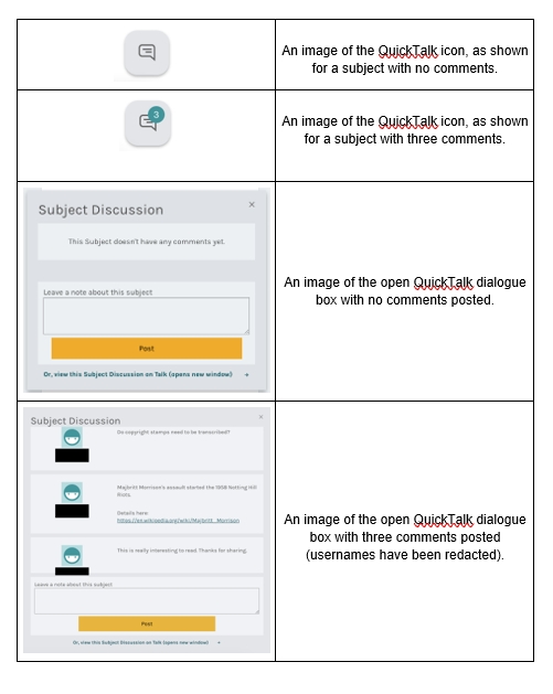 QuickTalk supports Communities & Crowds-style projects by allowing participants to see and post Talk comments about the subject they are currently classifying. Participants often use Talk to do things like work out tricky letterforms or a specific author’s handwriting in a transcription project, and access to this information can be extremely helpful while completing the project task. Other examples include participants sharing additional research or information about the subject, which can be useful for the task, but also for a participant’s individual interest in, and engagement with, the project’s content.