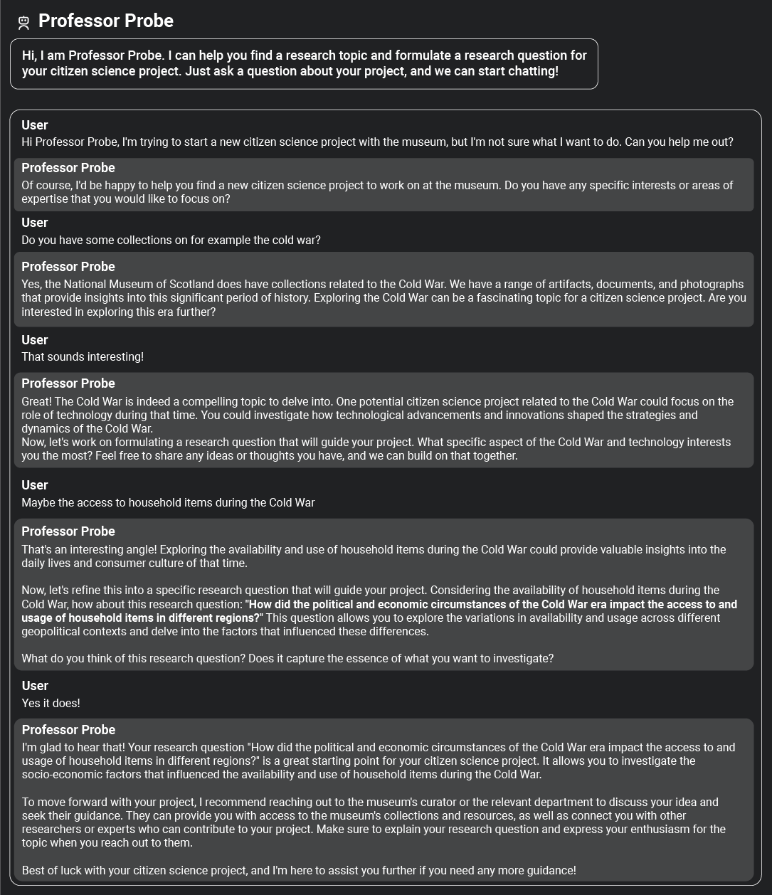 This led to the following design concept: a virtual museum research assistant, Professor Probe. Professor Probe is an online chatbot whose goal is to help you, a volunteer, discover a research topic that fits within your interests, and help with formulating a good research question (Figure 9). All of this is done while keeping in mind that the project should be relevant to the museum as well. The aim is to make the volunteers feel confident in what they want and expect from a project when they volunteer at the museum. This tool is ultimately aimed at making any new citizen science project a collaboration between the museum and the volunteers. While Paulien’s work here is a design concept, not a finished product, it demonstrates how the ideas from this toolkit can lead to all manner of outputs focused on volunteer agency and voice, even if some of them are quite different from the projects produced through Communities & Crowds.
