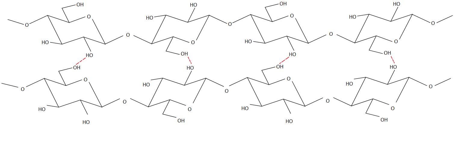 The fabrics discussed above, barring silk, are all derived from naturally occurring plant materials, whose principal component is cellulose. Cellulose is a long-chain polymer molecule in which the separate chains are bonded together by hydrogen bonding (see Figure 4). The properties of cellulose have a major impact on the final characteristics of the different plants that it constitutes. Variations, such as in the length of the cellulose chains, how well ordered and closely packed together these chains are, and whether the cellulose chains are present in a matrix with other materials, mean that different plant materials can have very different material properties (Hon, 1994).