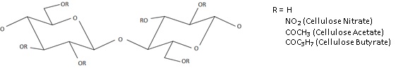The main group of materials discovered to be effective tauteners was cellulose esters. These are semi-synthetic plastics, in which the cellulose chain is modified by replacing a proportion of the hydroxyl groups attached to the main chain with a new chemical group (see Figure 5). Depending on the type of group used to replace the hydroxyl group, a very large number of products is theoretically possible, whose properties may further vary depending on factors such as how many hydroxyl groups are replaced, the distribution of the substituent groups along the chain, the length of the polymer molecules and the presence of impurities from the production mechanism (Zugenmaier, 2004).