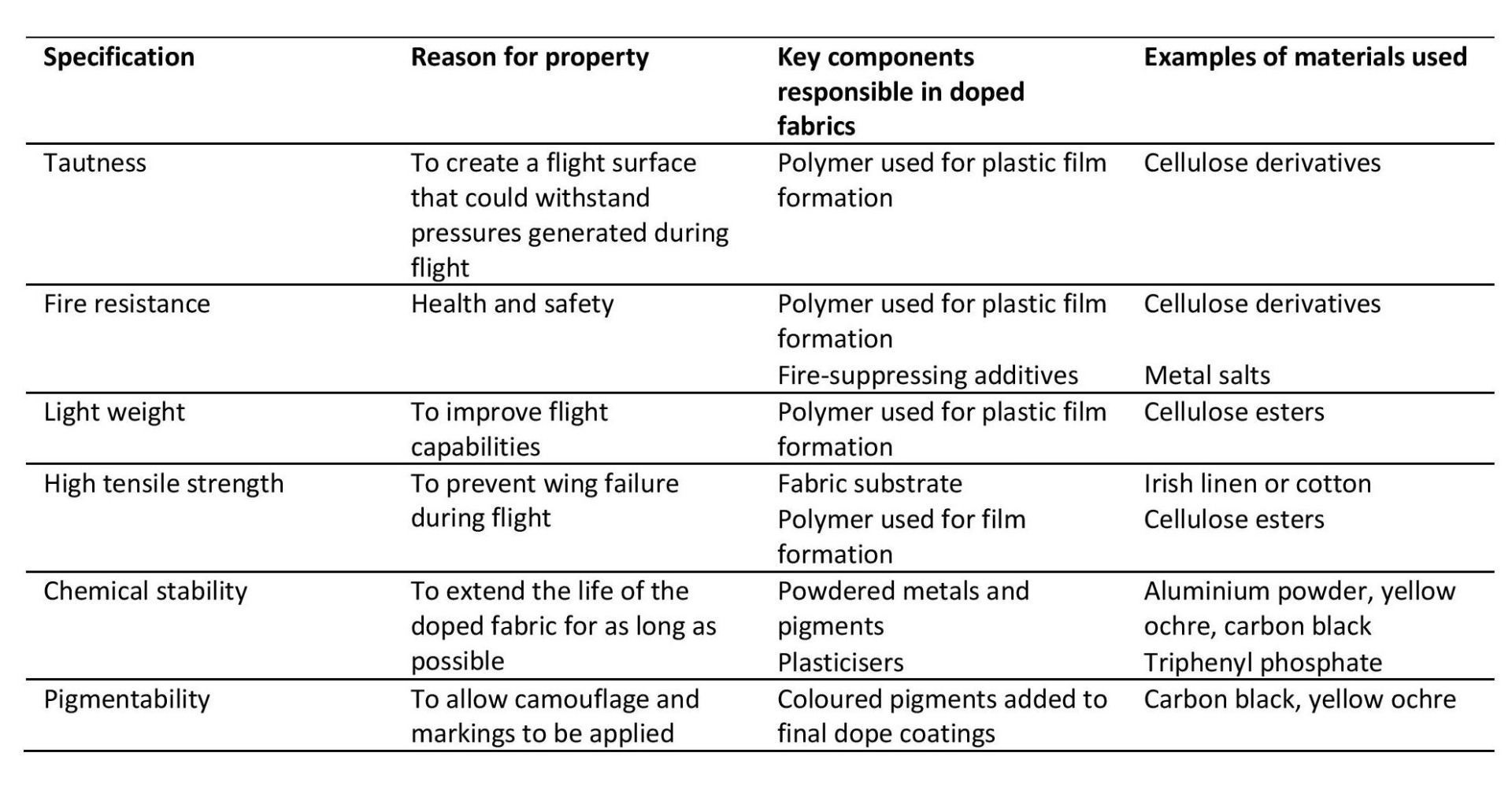 Beyond the material type, moreover, understanding why aircraft designers and manufacturers selected certain materials provides conservators with a much better insight into the outcomes and results they were hoping to achieve. As noted above, shrinkage of the fabric to make it taut was the primary purpose of applying dope to the fabric, but it was by no means the only consideration. Other requirements of doped fabric are summarised in Table 1, but this list is not exhaustive, and other considerations could be added, such as economy and ease of use.