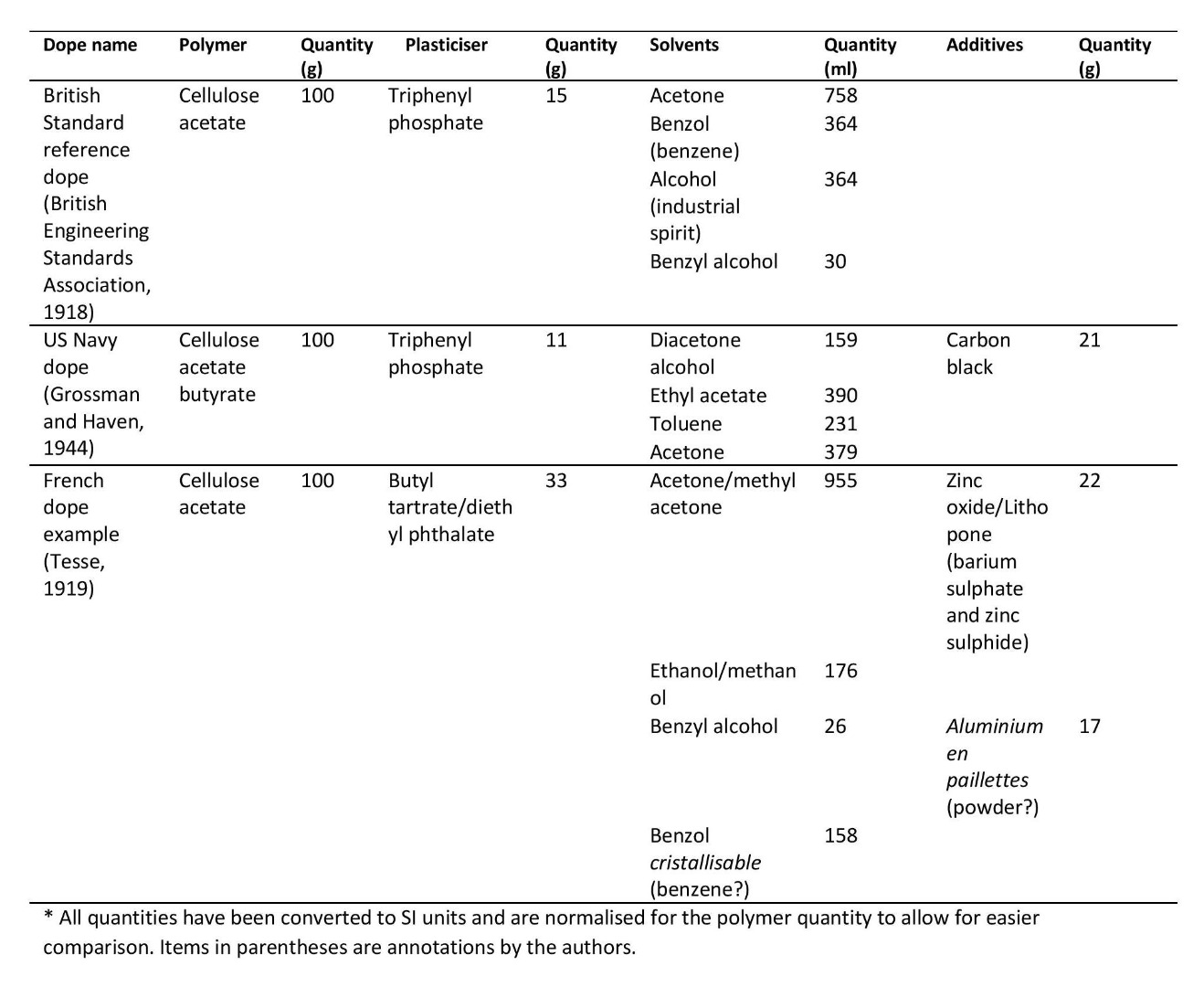 On the other hand, these generalities still mask a very high degree of variability, with different materials and processes used in different times and locations. A few examples of dope recipes proposed and used in various times and parts of the world are provided in Table 2. These examples help to indicate the range of materials used just within the dope, but it is also worth remembering that this variability extends to other decisions such as the choice of fabric and the application of protective varnishes.