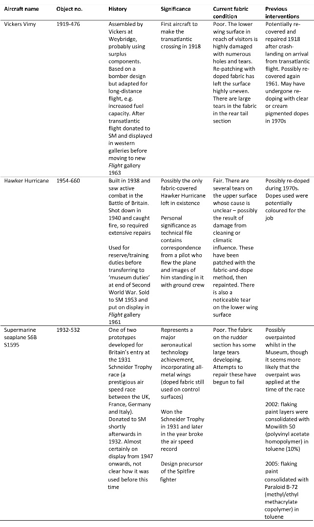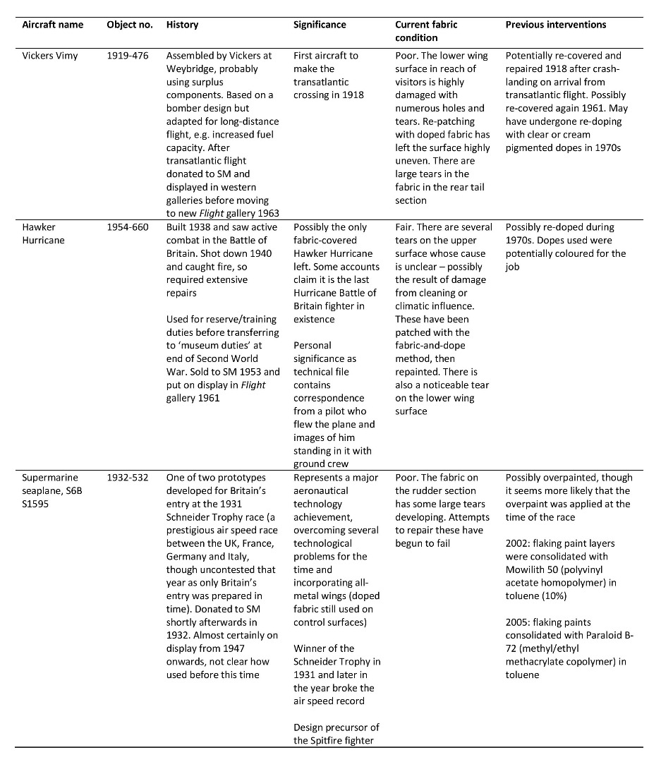 It also discusses current conservation methods used for treating tears in the doped fabric covering of aeroplanes, and considers the ethical and practical limitations of these practices. An overview of the doped fabric aircraft collection currently held by the Science Museum is also presented.