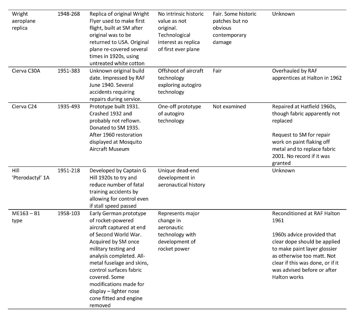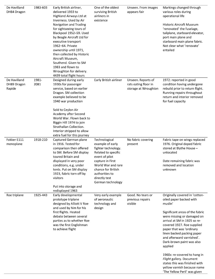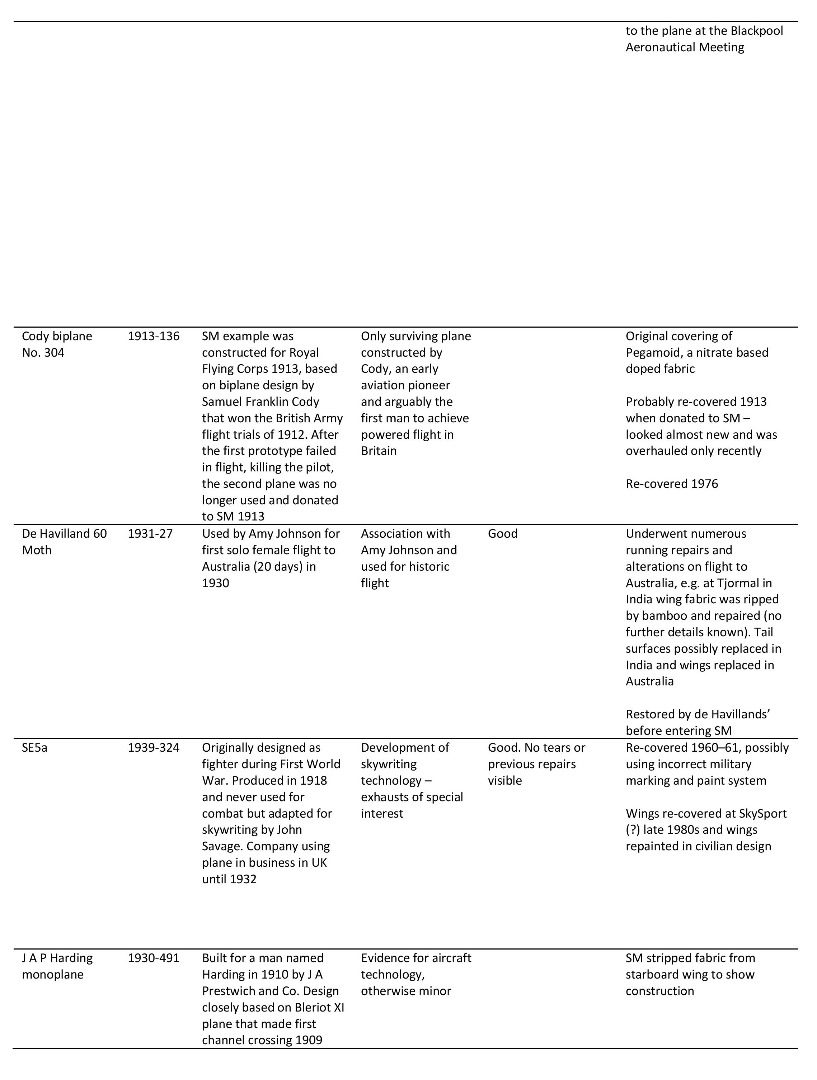 The majority of information relevant to the Museum’s aircraft is kept in technical files, where notes, articles and correspondence about the objects are maintained and added to, usually by curatorial staff. Information of relevance to this project kept in the technical files for three of the Science Museum’s doped fabric aircraft is summarised in Table 3 (see Appendix for details of additional doped fabric aircraft).