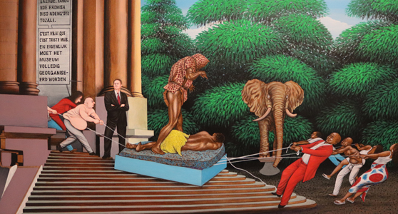 The image of the statue became widely spread within Belgian society, even featuring within the popular and heavily racialised Hergé comic, Tintin in the Congo, first published in 1946.[3] In the spirit of change, the Anioto is no longer a prominent feature of the RMCA’s new exhibition space and is instead featured in the room titled ‘Sidelined’ (a space which recontextualises a selection of colonial archive material and objects). The accompanying label now remarks that ‘Such leopard men existed, but only in the context of ritual warfare, and then only in a limited area’. New curatorial narratives are not guaranteed to change the visitor’s view of the Anioto; however, it is good that the Museum recognised former views and denounced these through the object’s label.[4] With the ninetieth anniversary of Tintin in 2019, the cover of the newly printed covers of Tintin in the Congo have been changed from a racist caricature to an encounter between Tintin and a lion. ‘Réorganisation’, a work in the new RMCA by artist Chéri Samba also references the Anioto statue. The piece shows RMCA staff and Central Africans fighting over whether to keep or remove the Anioto statue from the Museum.