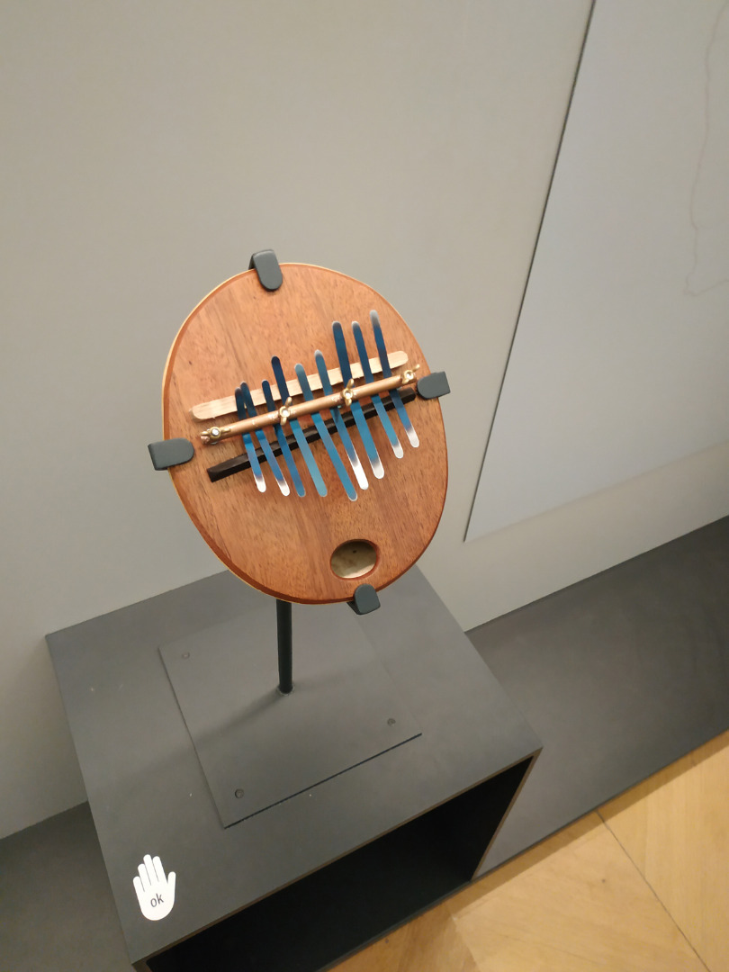Though the majority of objects in the new Museum are in cases, touch objects within the gallery provide the opportunity for visitors to directly engage with objects. This is a method which is also employed more and more frequently in museums. UK examples including the Secret Life of the Home gallery (Science Museum) and the Sea Things gallery (National Maritime Museum). The new RMCA uses this interactive approach particularly effectively when focusing on its collections of musical instruments, providing, for example, a slit drum which can be played as it would in the set-up of an orchestra from the Congolese Pende community, or a dancefloor upon which to learn the dance moves to contemporary Congolese music (for example, rumba). At the time of my visit I was able to see a visitor playing a Kalimba, releasing a sound which enriched the sound environment of the African languages and music room. During my visit the adult visitors appeared to be too shy to directly follow the dance tutorials which were provided on a large screen in the studio rumba room. This changed, however, when a school group entered the room and over twenty children began to learn the basics of Congolese rumba.