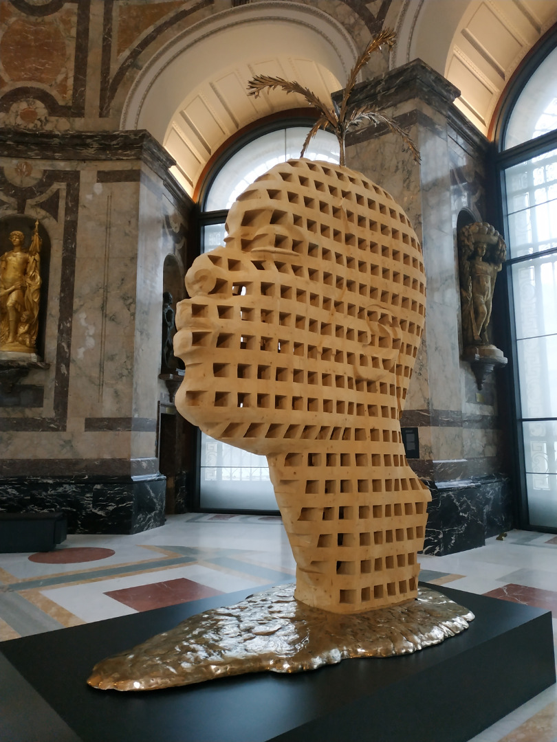 Despite the joys of the Languages and Music gallery, not every area of the refurbished RMCA is successful in its efforts to decolonise. Though the content of the exhibition spaces has changed, it is important to note that colonialism is frequently woven into the very architecture of museum buildings. The grandeur of the buildings reflects colonial ideologies of wealth and superiority, creating spaces that memorialise the politics of the day. The Rotunda and Lieu de Memoire (site of memory) are two such places which directly attempt to tackle the problematic nature of colonised spaces. Both feature commissioned artwork from African artists in direct dialogue with the colonial buildings: Aimé Mpane’s work featuring in the Rotunda space, and Freddy Tsimba’s work featuring along the Lieu de Memoire.