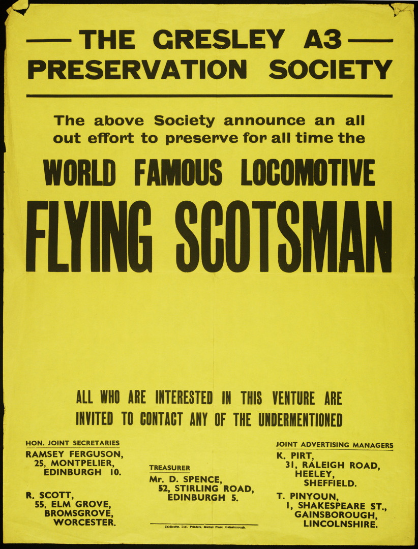 But in 1962 the future of the locomotive of the same name was less assured. The British Railways (BR) modernisation programme launched in 1955 marked the beginning of the end for steam. When it was revealed that steam would continue into the 1970s, BR accelerated the programme of scrapping locomotives (Gourvish, 1986). The statistics are revealing: in 1953 there were still 18,600 steam locomotives operating on the British railway system; but by 1962, Flying Scotsman’s last full year in service, the number had more than halved to 8,800 and within six years that had dropped to zero (Gourvish, 1986 p 275). To ensure historic locomotives or relics survived a number of locomotives were identified for preservation. However, amongst the omissions was Flying Scotsman, which was earmarked for scrap. In 1962 the Gresley A3 Preservation Society was established to raise funds to save the locomotive but in the event they could not match the £3,000 asking price.