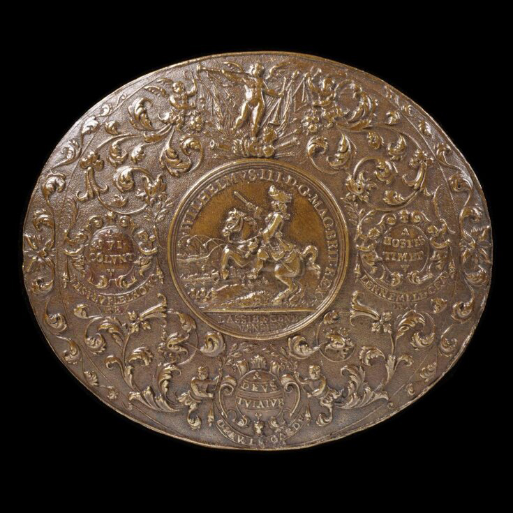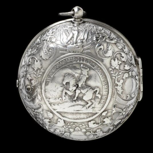 Two early-eighteenth century objects in the V&A metalwork collection give an indication of the quality of Dassier’s die-stamped luxury goods. A Dassier watchcase and a plaque, possibly intended as the lid of a box, look like high-quality chasing but were certainly stamped, using the same die.[5] The medallion of William III at the centre of the design shows obvious associations with the making of coins and medals, but clearly the plaque in Figure 3 is something else, a decorative metalware component, and the watchcase in Figure 4, which still contains its watch, is obviously not a medal. Eisler’s work makes it clear that Dassier’s watchcases were stamped as flat objects in low relief, like uniface medals and like the plaque in Figure 3, then shaped into watchcases by a process still unidentified, possibly involving the careful hand-tool pressing of the flat stamping over a wood or lead former, in such a way as to avoid flattening and spoiling the stamped design.