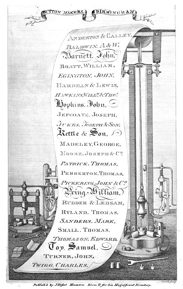 The mistaken emphasis on the Pickering patent seems to emanate from Henry Hamilton’s history of the brass industry, written in the 1920s and still the main reference work on the topic. Hamilton maintained that the introduction of the stamped brass foundry trade to Birmingham ‘is usually associated with an invention by one John Pickering’. Hamilton concludes that Pickering’s 1769 patent ‘was the idea which was at the root of the whole stamped brass foundry trade’, and that this trade developed and became specialised so fast that ‘even in 1770, there were various stampers, die sinkers, stamp and press makers and button stampers in Birmingham’ (Hamilton, 1926). Fast indeed, for an entire community of specialists and supporting infrastructure to have developed in a year.