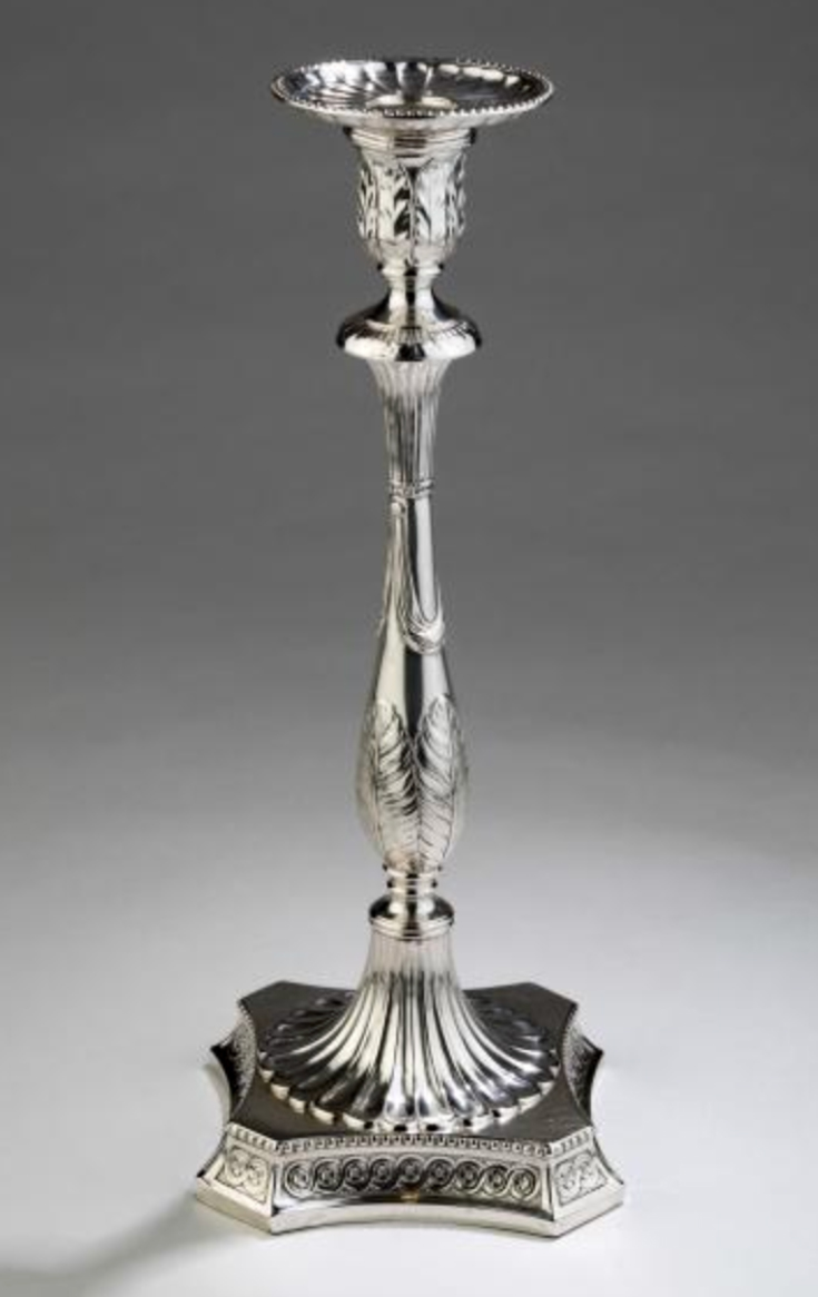 The full potential of the drop stamp was realised by the Sheffield plated trade, which developed drop stamping in high relief in order to emulate the appearance of cast silver candlesticks, by stamping plated sheet into high relief components which were then soldered together to create the appearance of a solid cast silver candlestick. Though sold at a much lower price, the stamped plated and then silver candlestick could match or exceed the quality of cast silver. Stamped candlesticks competed so effectively in the luxury market that they drove cast silver candlesticks out of production: stamping became the standard way of making a silver candlestick.[14] Products such as the Boulton and Fothergill stamped candlesticks (see Figure 7) offered a medallic level of detail and precision which met the late-eighteenth century appetite for neoclassical decoration in ways that would have been difficult or impossible with traditional hand-craft casting methods.